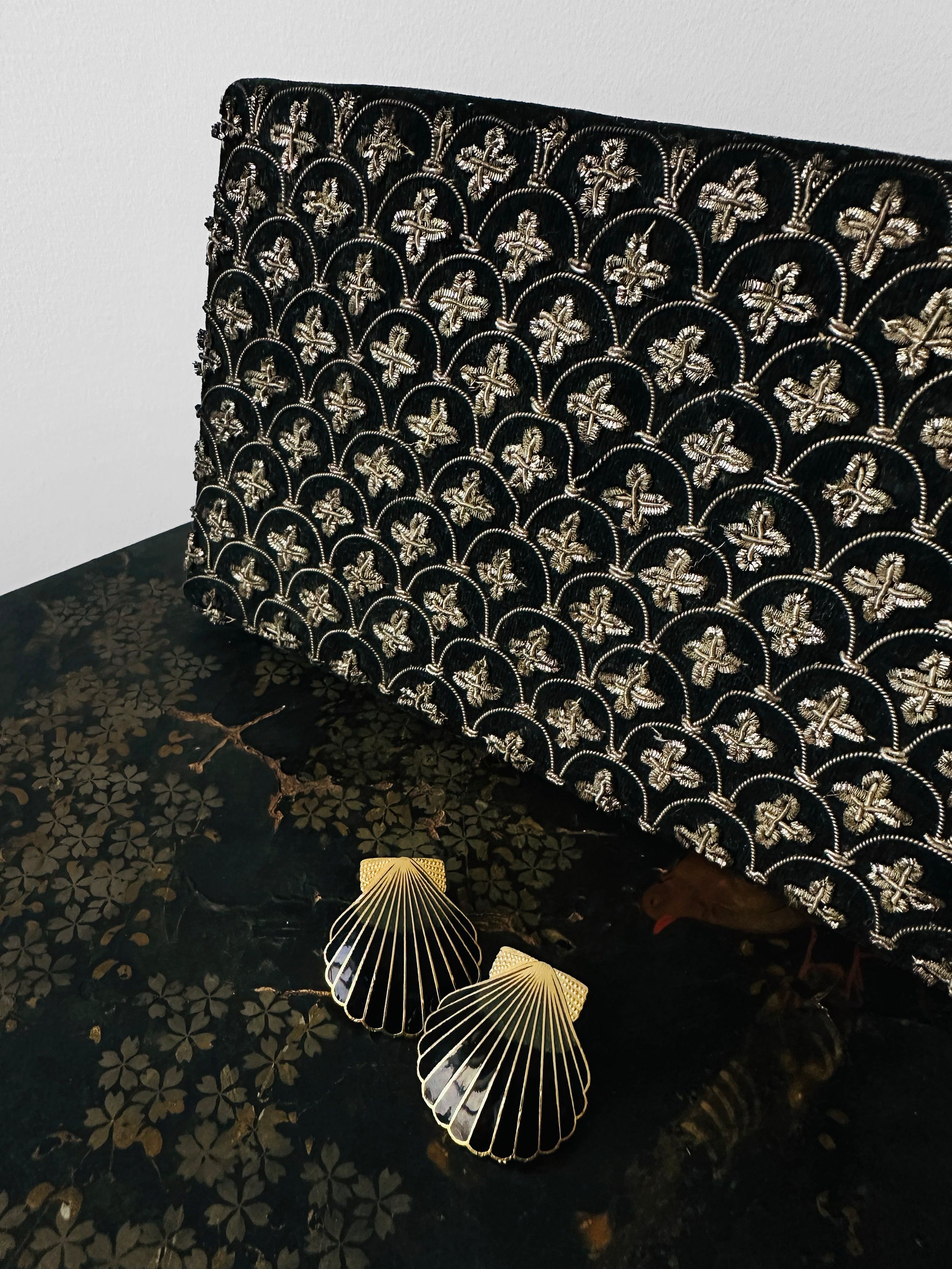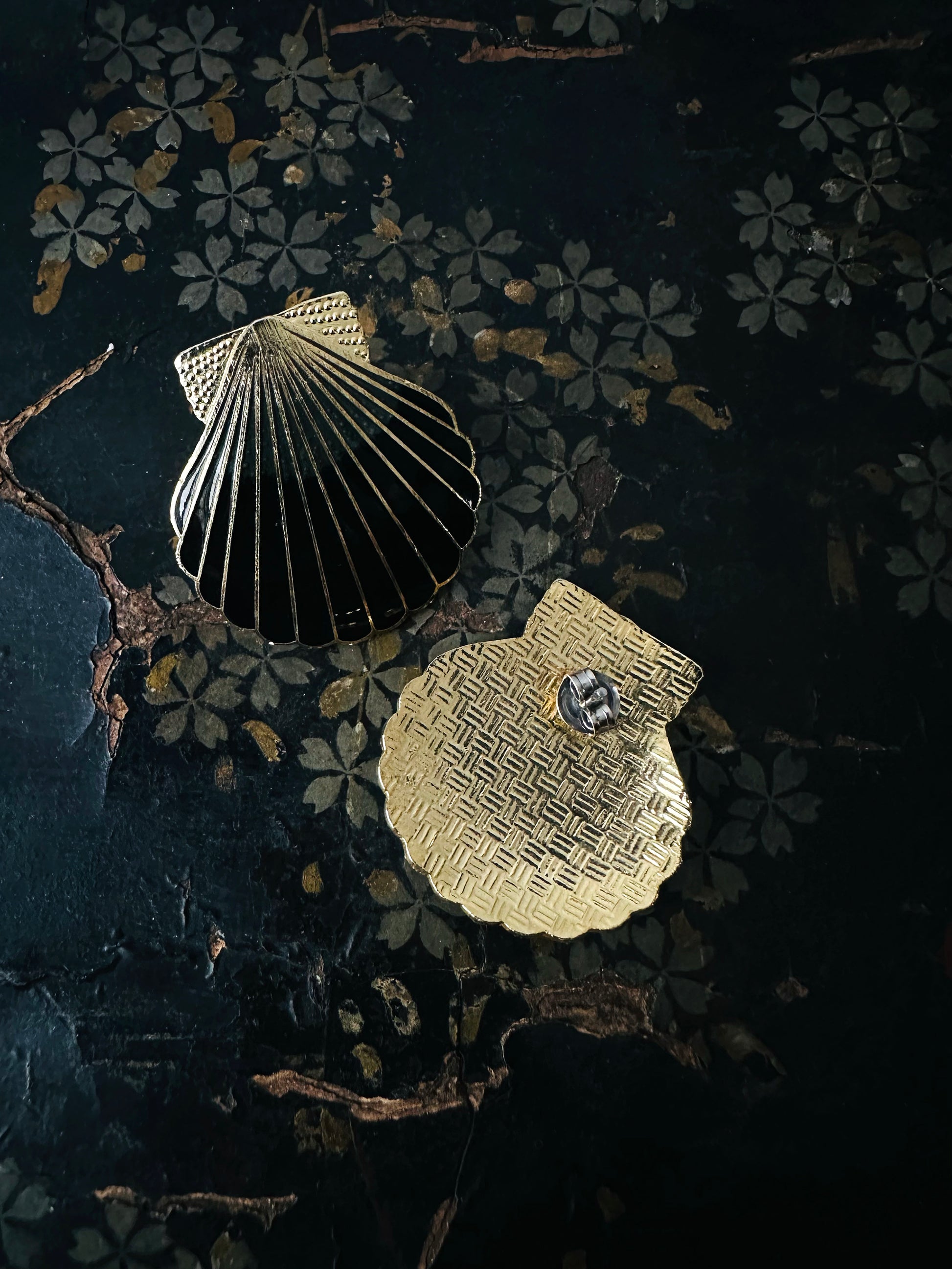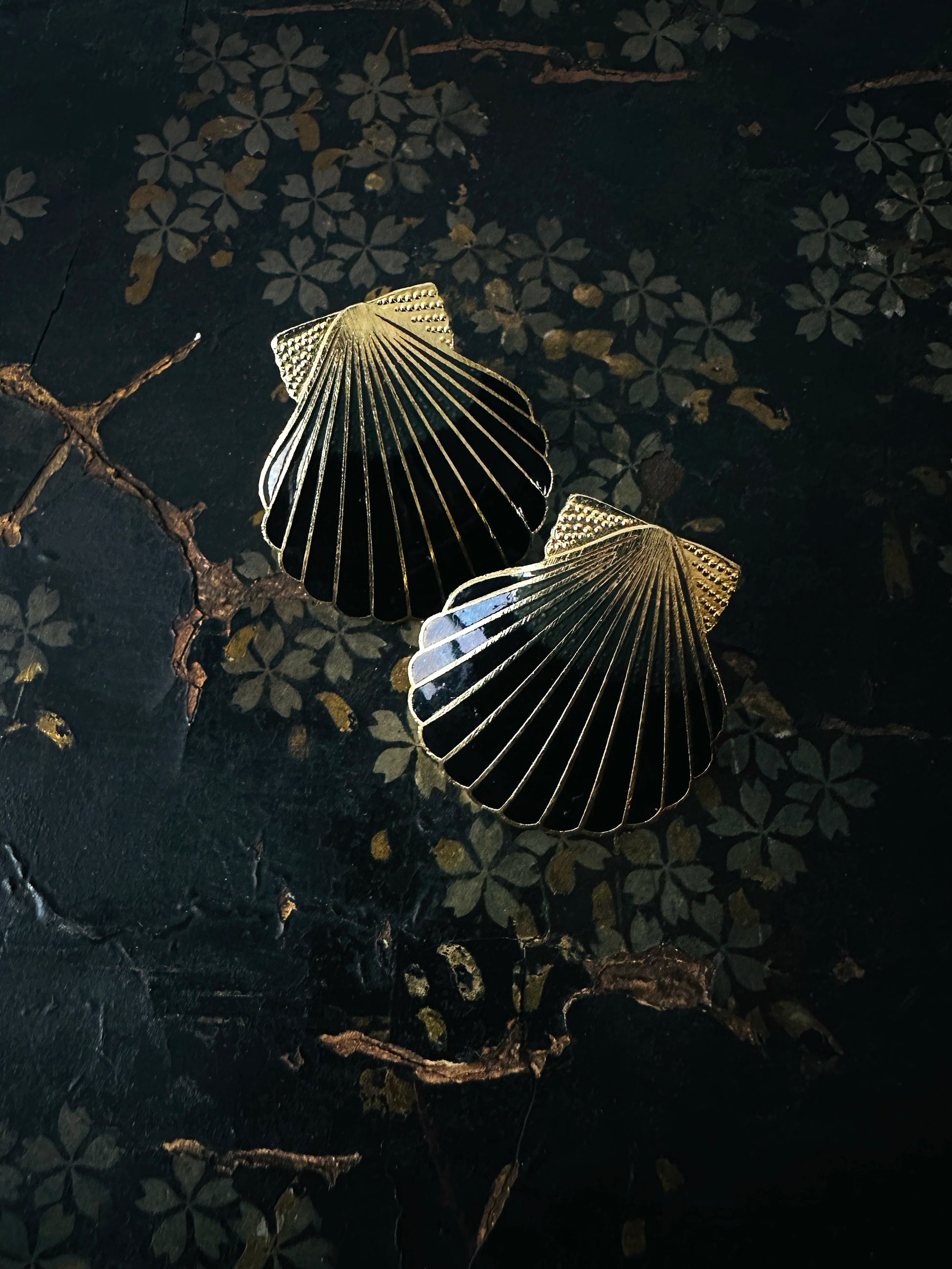 DESCRIPTION: Step into the glamour of the 1980s with these stunning scallop shell earrings. Their sleek black enamel finish, framed in radiant gold-tone metal, captures the essence of refined vintage style. Bold yet graceful, these earrings are a perfect blend of classic artistry and modern sophistication—ideal for elevating any look from day to evening.