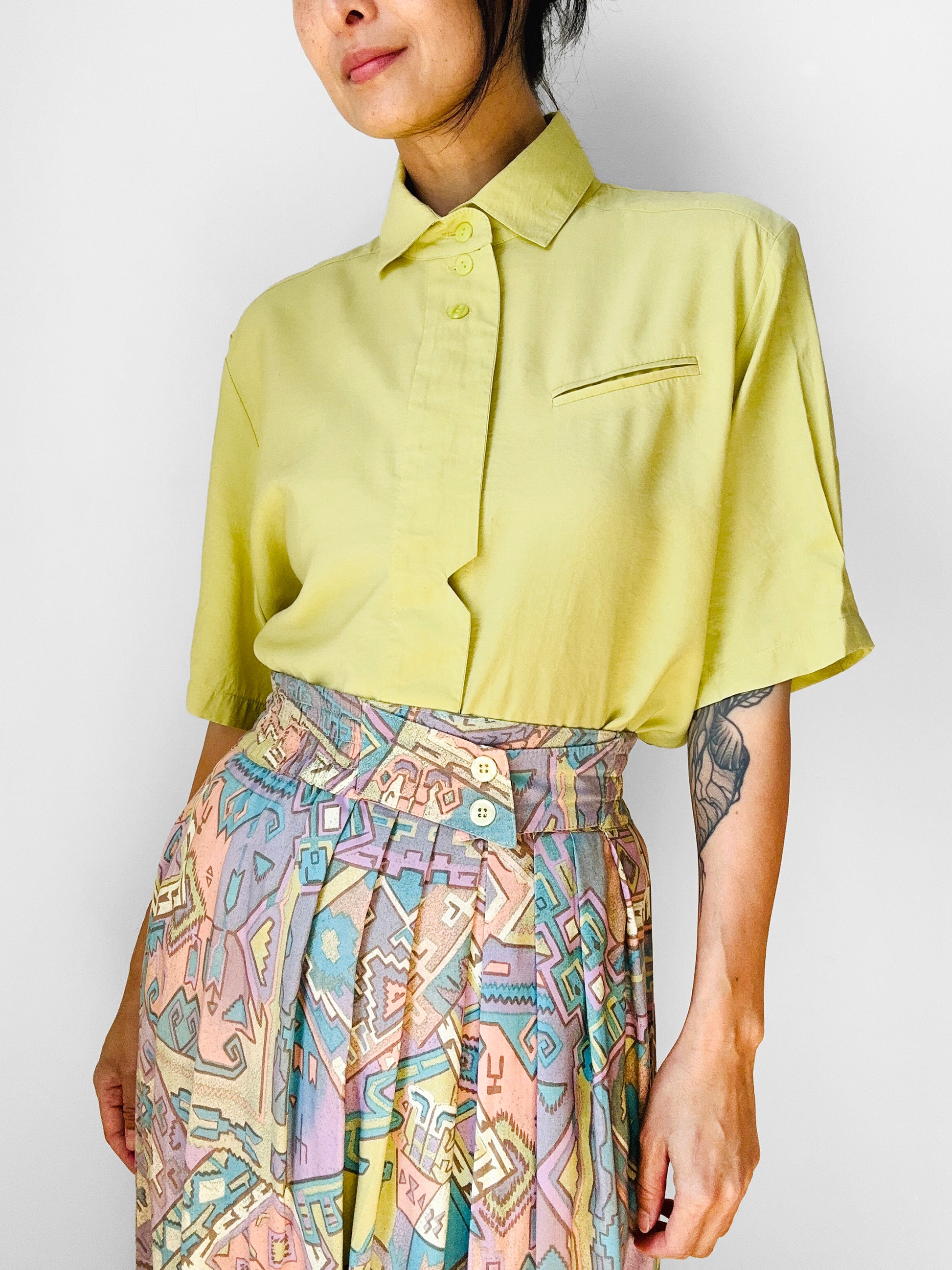Love the artsy flare on this lightweight fully lined skirt. Feels incredibly light and cool against the skin. True 80s perfection. In overall, excellent, gently worn, vintage condition.