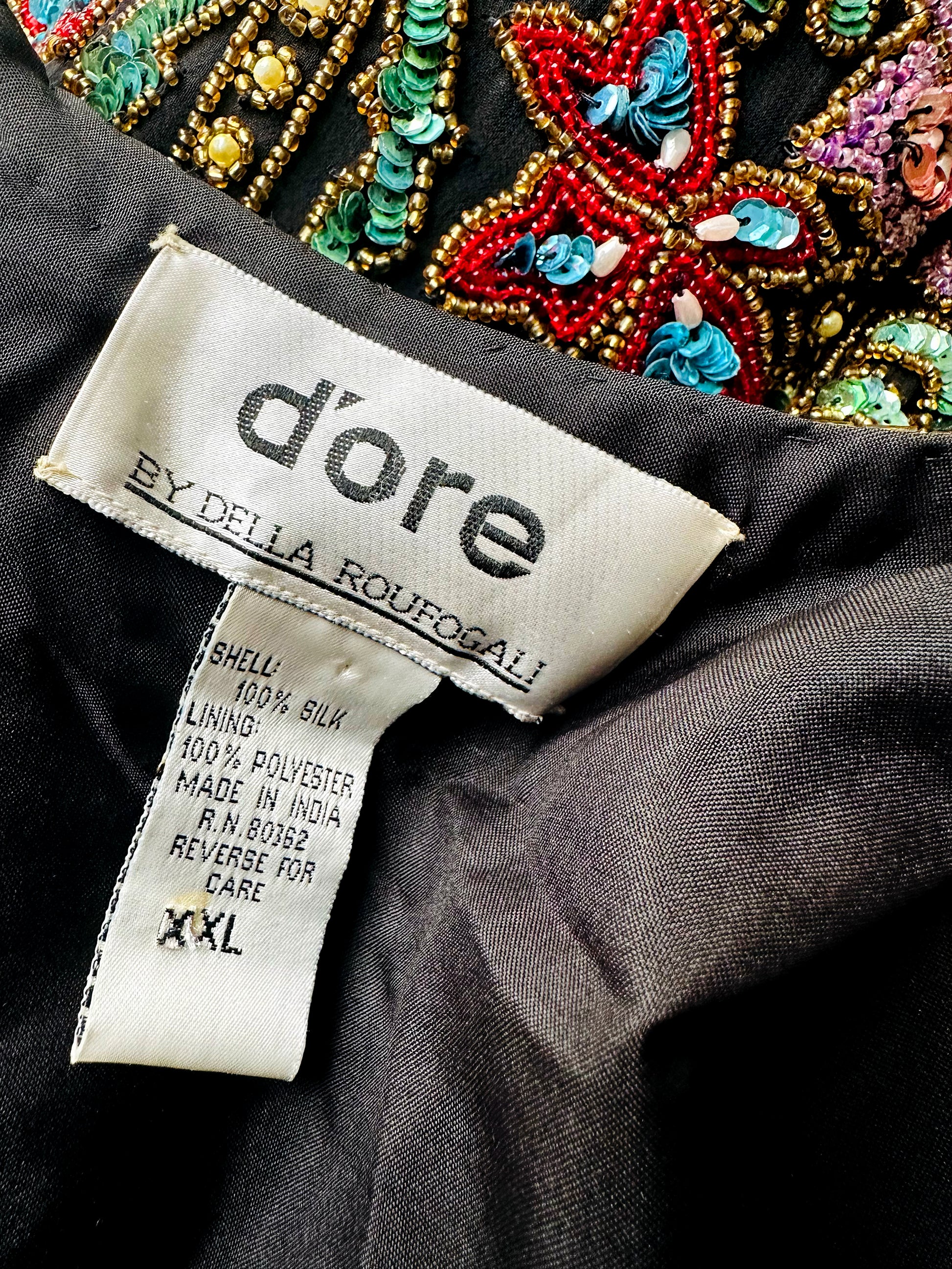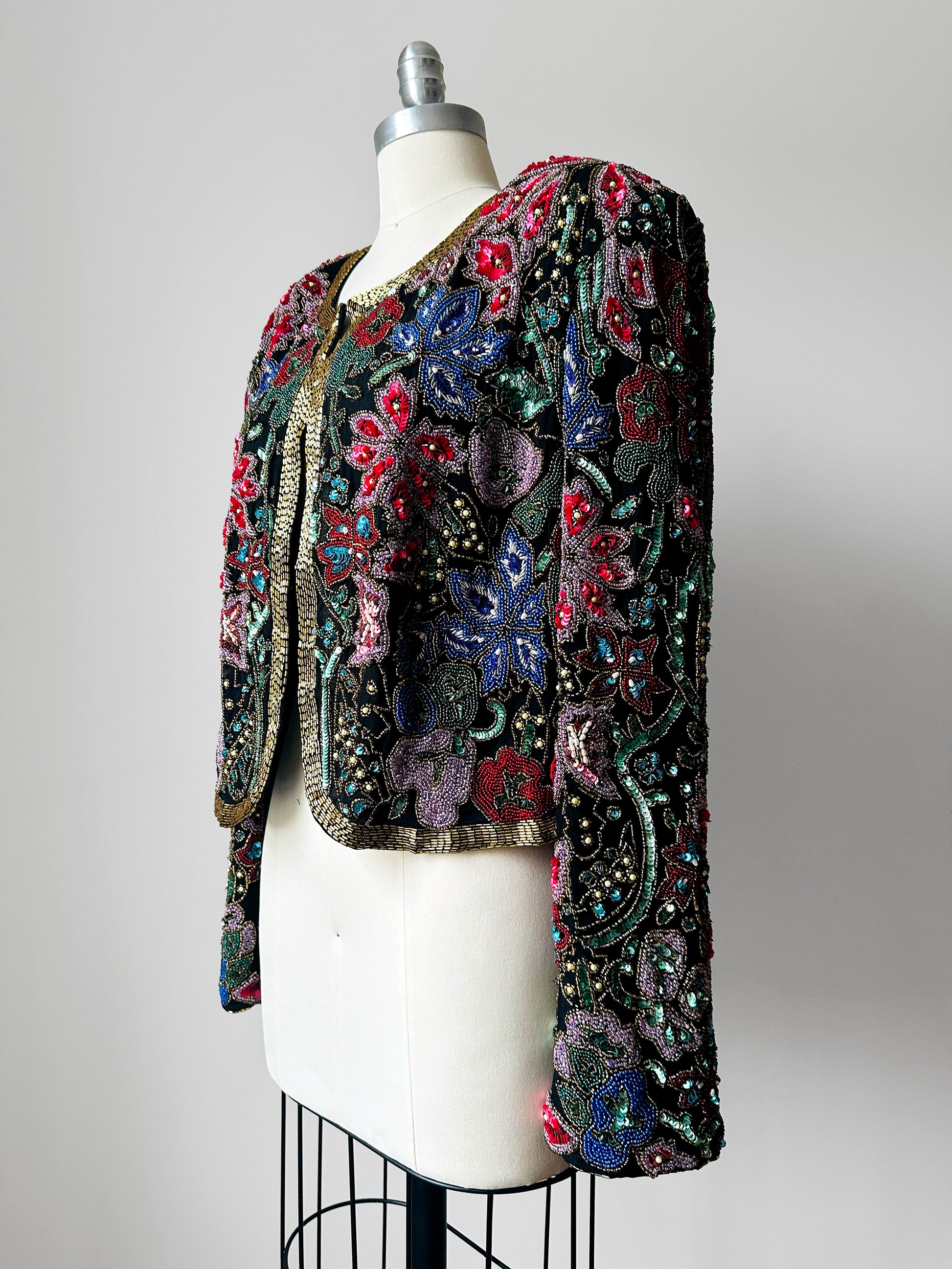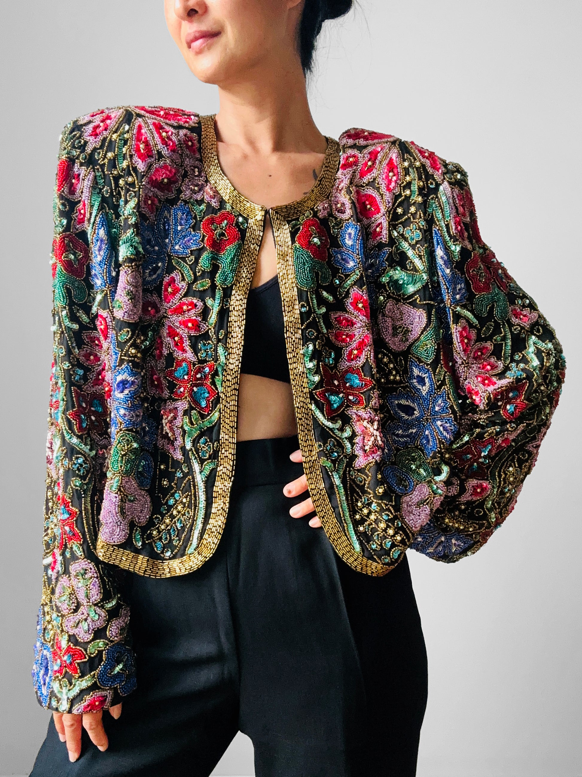 This jacket is above and beyond when it comes to quality and eye appeal. It is fully encrusted with the most beautiful mix of sequins and beads on a bed of black silk. A true show stopper. Make this your next must-have investment, for your growing vintage glam collection.