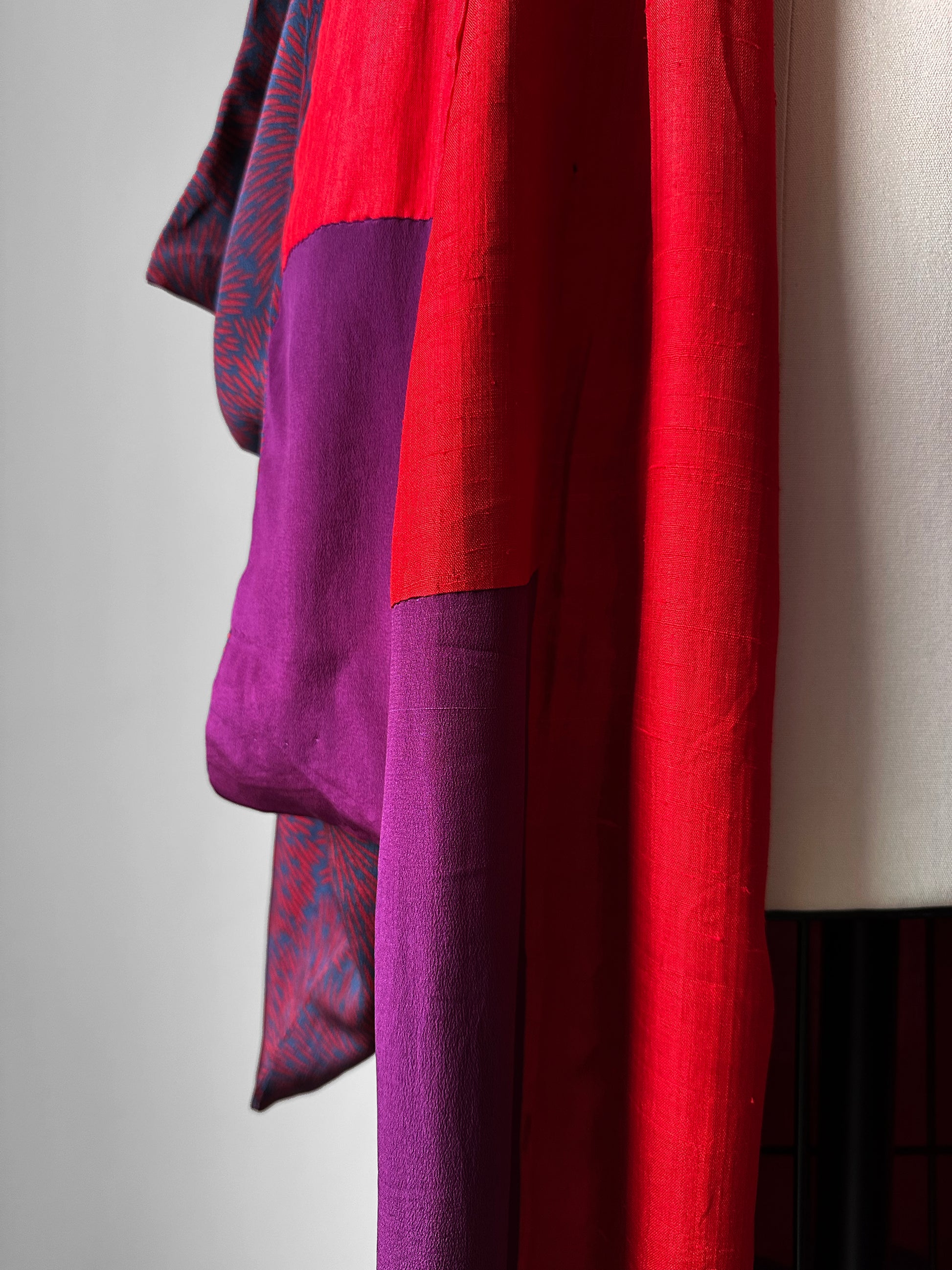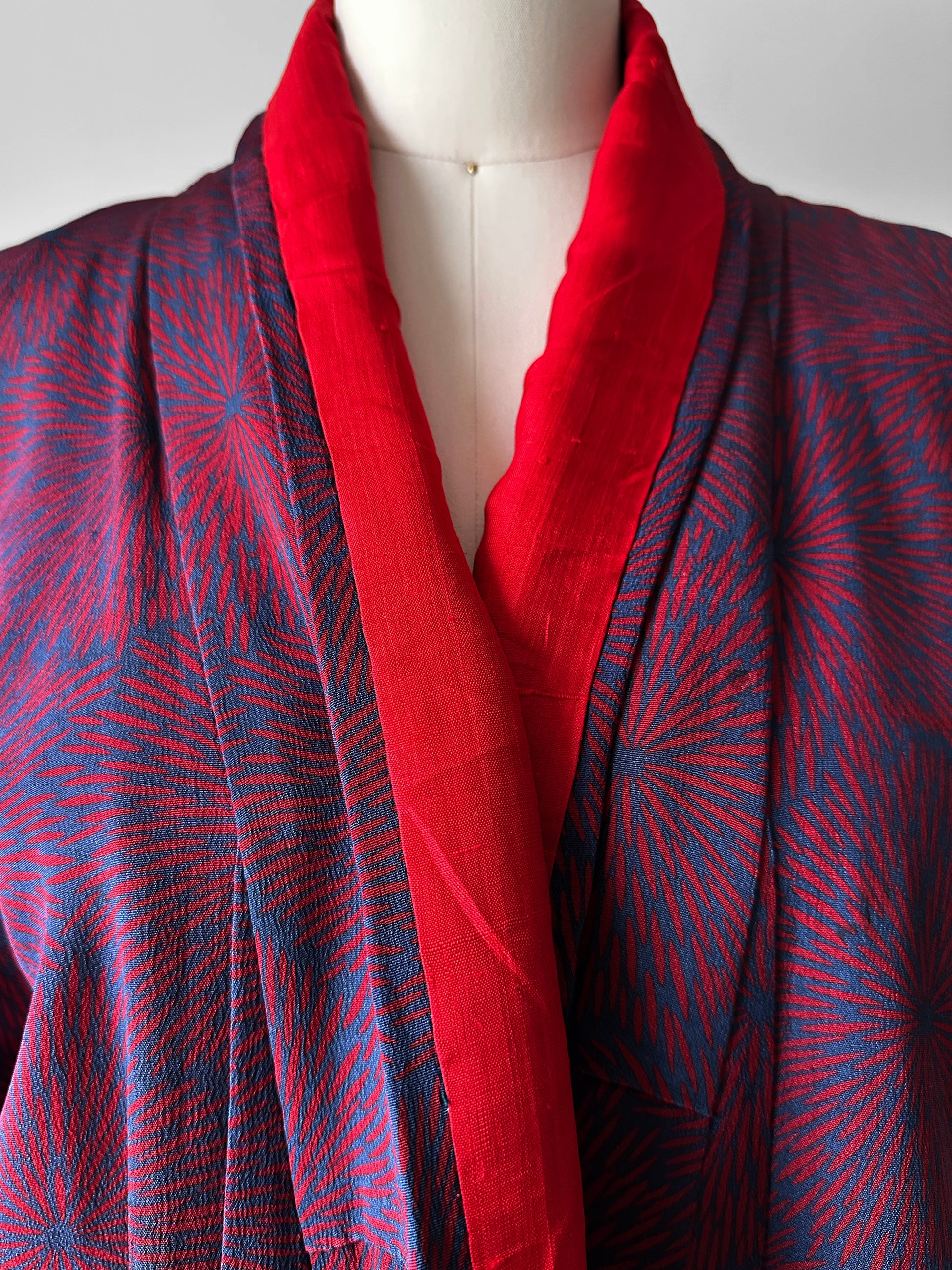 This is a true stunner. The gorgeous palette and sunburst pattern on this kimono is exceptional. Done in a beautiful high quality silk fabric that is fully lined and drapes like an absolute dream. Love this for layering and for wear out as a duster or robe. I'm a shorty so it's too long on me to wear out as a duster coat. If I were to keep this I would have it hemmed up to create a more midi-length duster or crop it up to a jacket or Haori length and get creative with the remaining fabric.