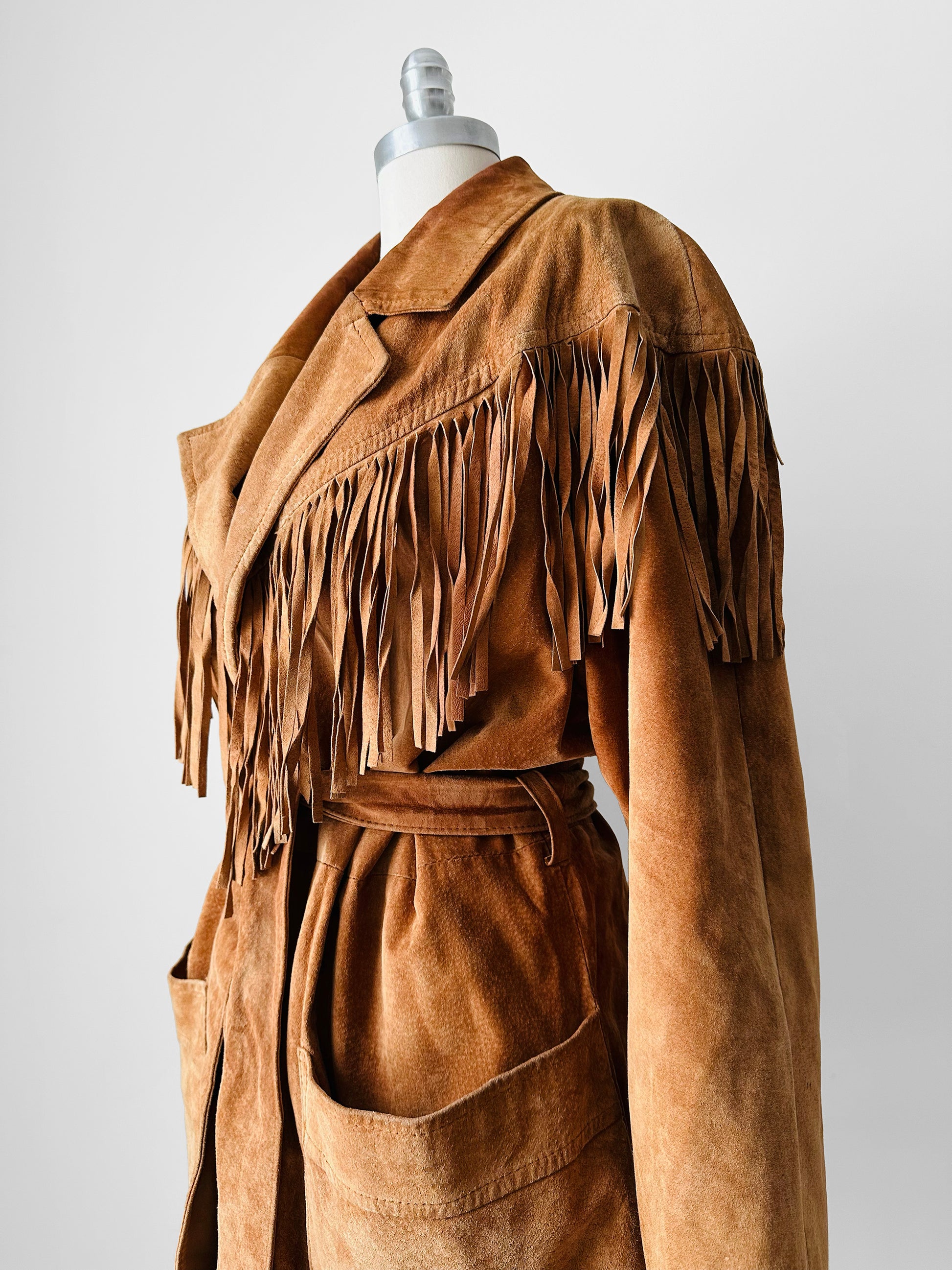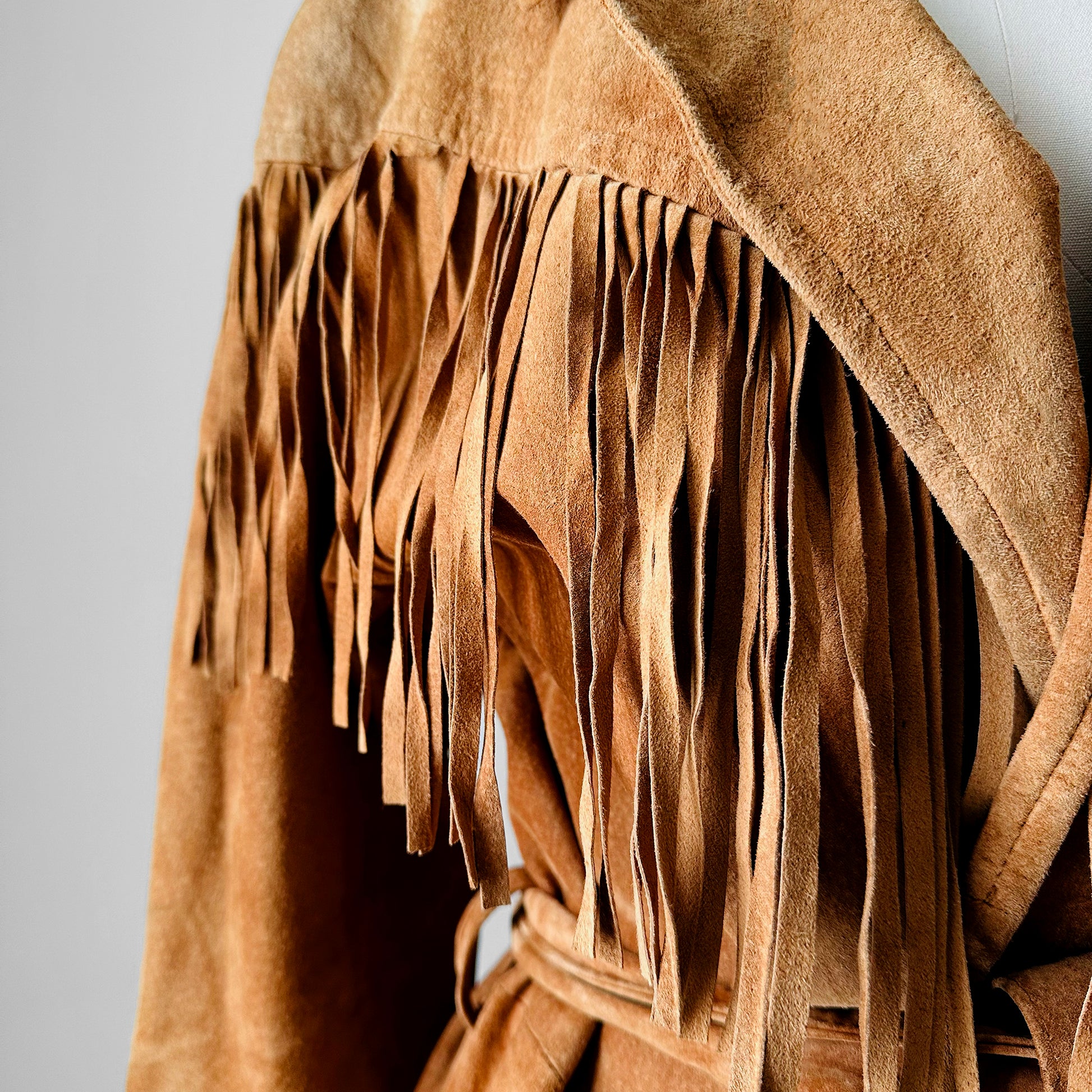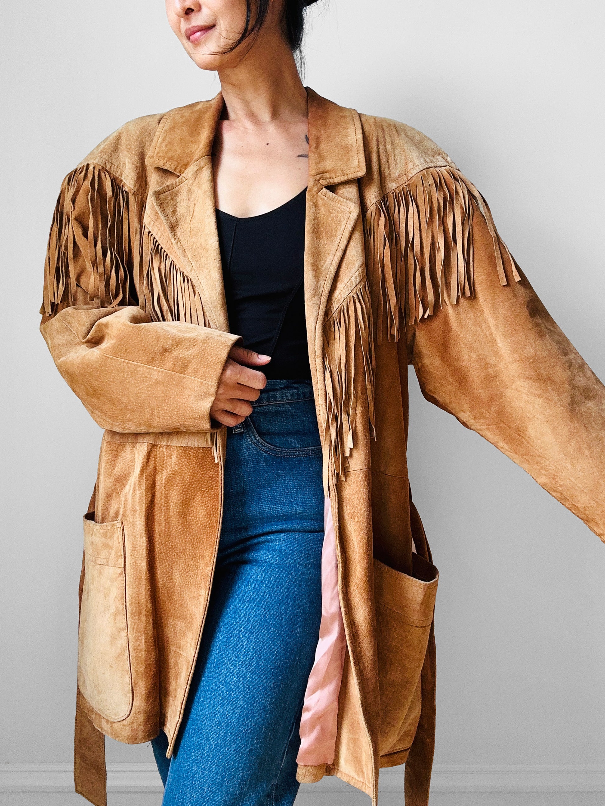 1980s Tan Suede Leather Fringe Patched Belted Jacket - Sz. L