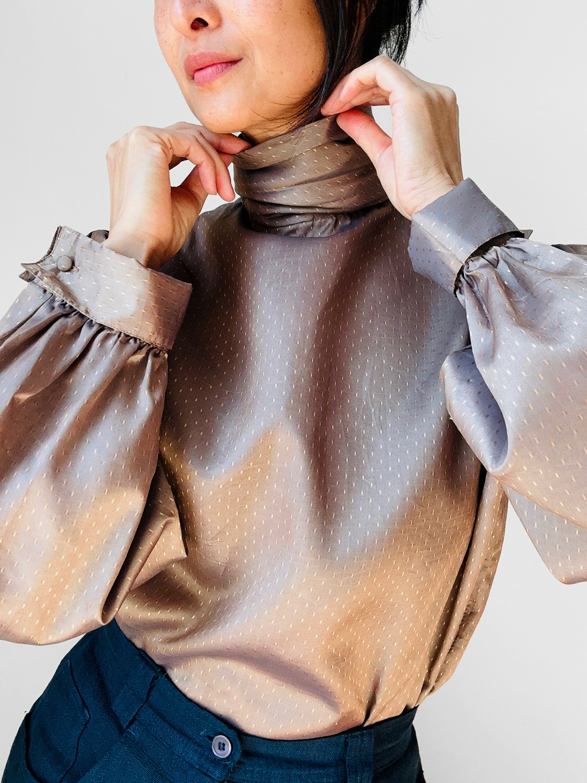 DESCRIPTION: This blouse is pure 80s glam and makes a statement without even trying. From the elegant ruched collar to the delicate metallic gold thread shimmering against the smooth taupe fabric, every detail is perfection. The structured silhouette gives it a polished edge, while the subtle sparkle adds just the right amount of drama. Pair it with high-waisted trousers for a power-dressing moment or tuck it into a sleek pencil skirt for evening chic. This isn’t just a blouse—it’s a showstopper that brings vintage sophistication into the modern wardrobe.