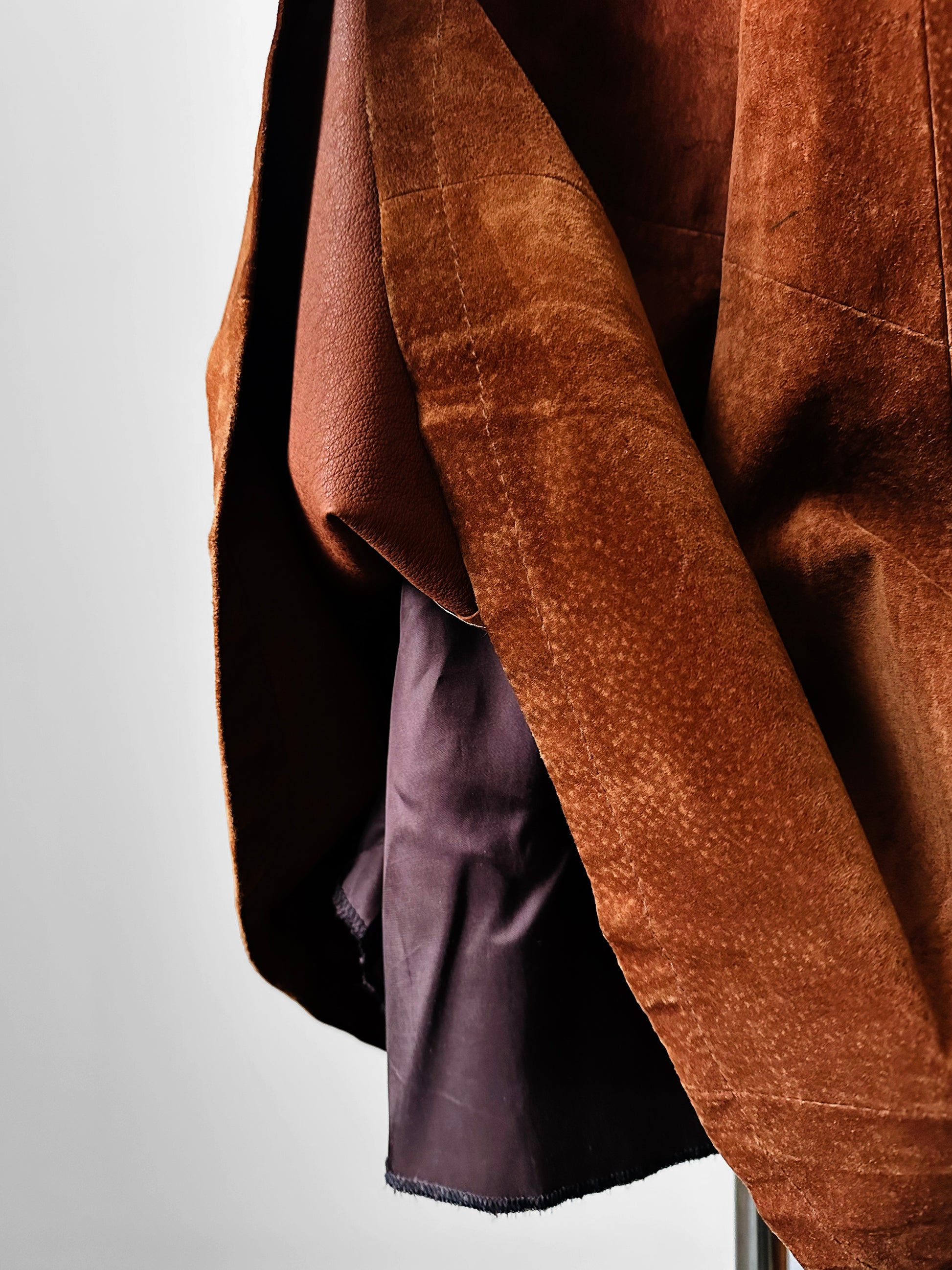 DESCRIPTION: I’m endlessly drawn to the allure of a perfectly aged leather or suede—there’s nothing quite like the character that comes with time. For me, the more lived-in, the more luxurious. The distressed suede radiates vintage charm, while the color—rich, velvety, and effortlessly chic—is an absolute dream. Its midi length and flared silhouette strike that sweet spot between timeless elegance and modern edge. Paneled construction and a tailored waistband elevate the design, making it a statement piece that transcends trends. This is the kind of skirt that doesn’t just complement a wardrobe—it defines it.
