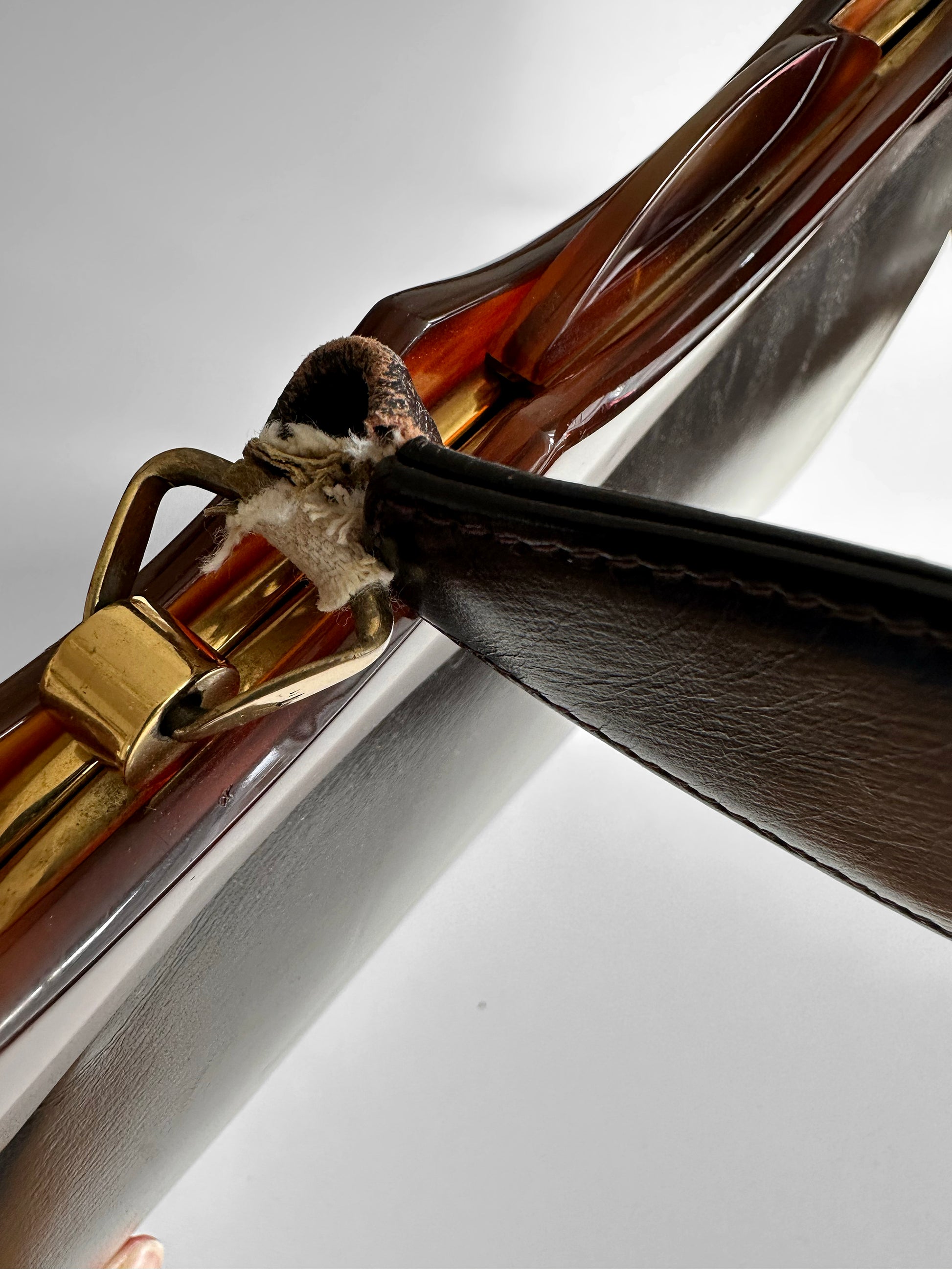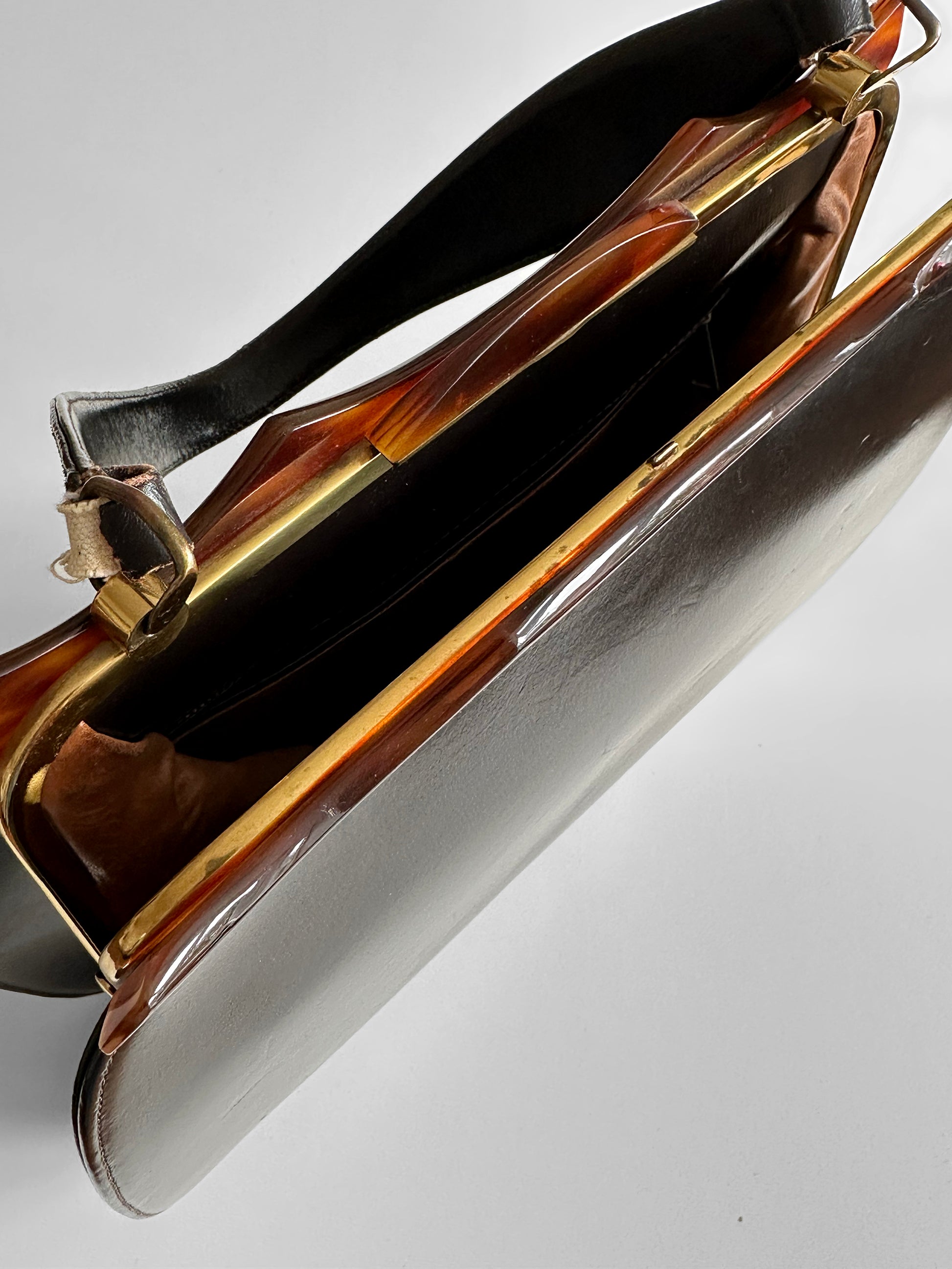 1960s Dark Brown Black Top Handle Leather Tortoise Shell Frame Bag