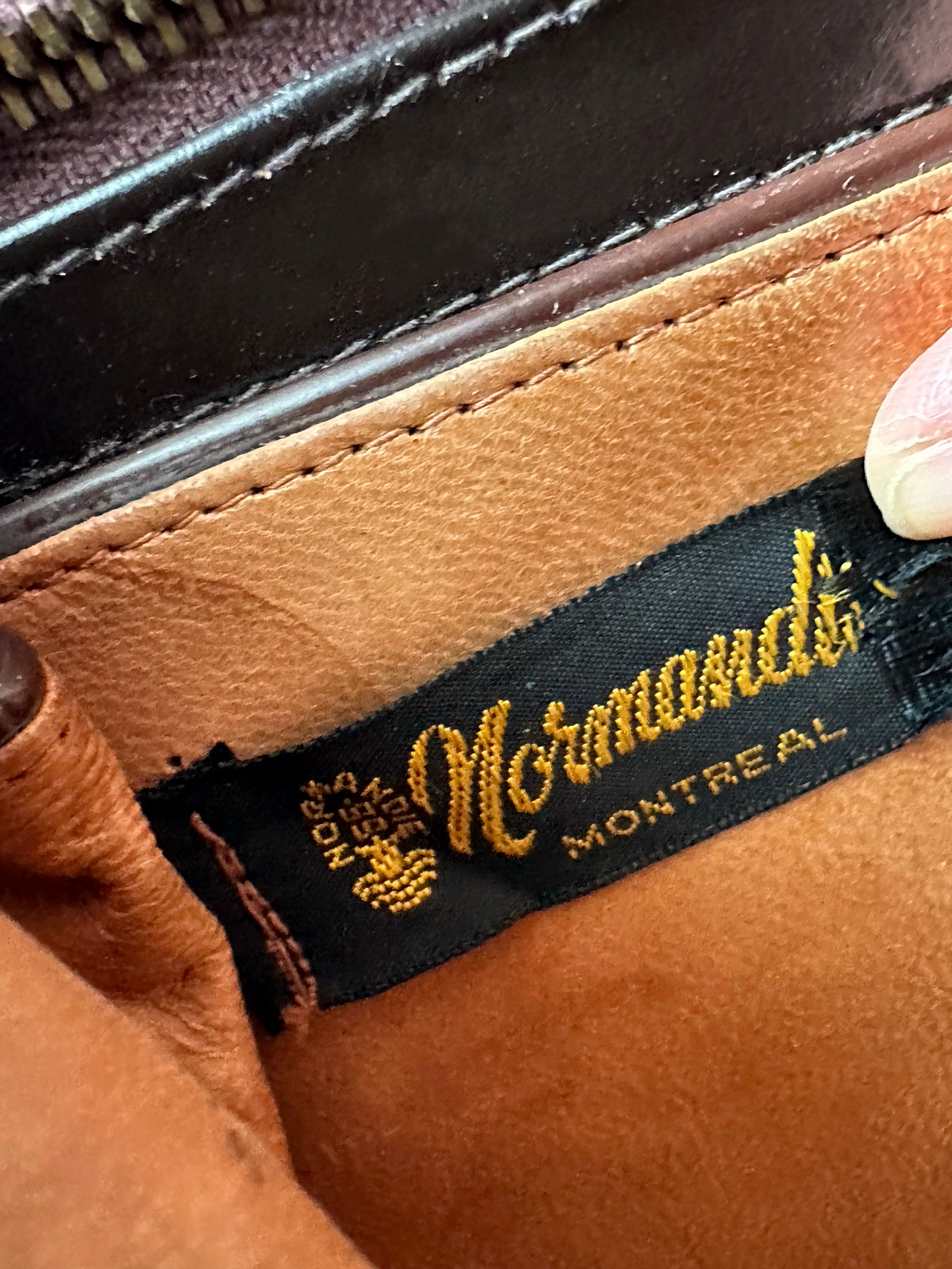 This 60s large scale top handle bag is done in a rich brown black tone with a full caramel coloured leather interior. I would say it looks more black in person until it hits sunlight. A true classic. In overall, excellent, well worn, vintage condition. One side of the bag has more surface wear than the other and the handle leather is worn away where they meet the handle. This doesn't seem to affect the usage and sturdiness of it though. The attached areas are still strong. I would recommend taking this to your local leathersmith to have them reinforce it, more for visual effect. Please take the time to look through all of the images in the gallery as they show all of the wear and distressing you can expect to see on this item and act as part of the items description. Price reflects wear.