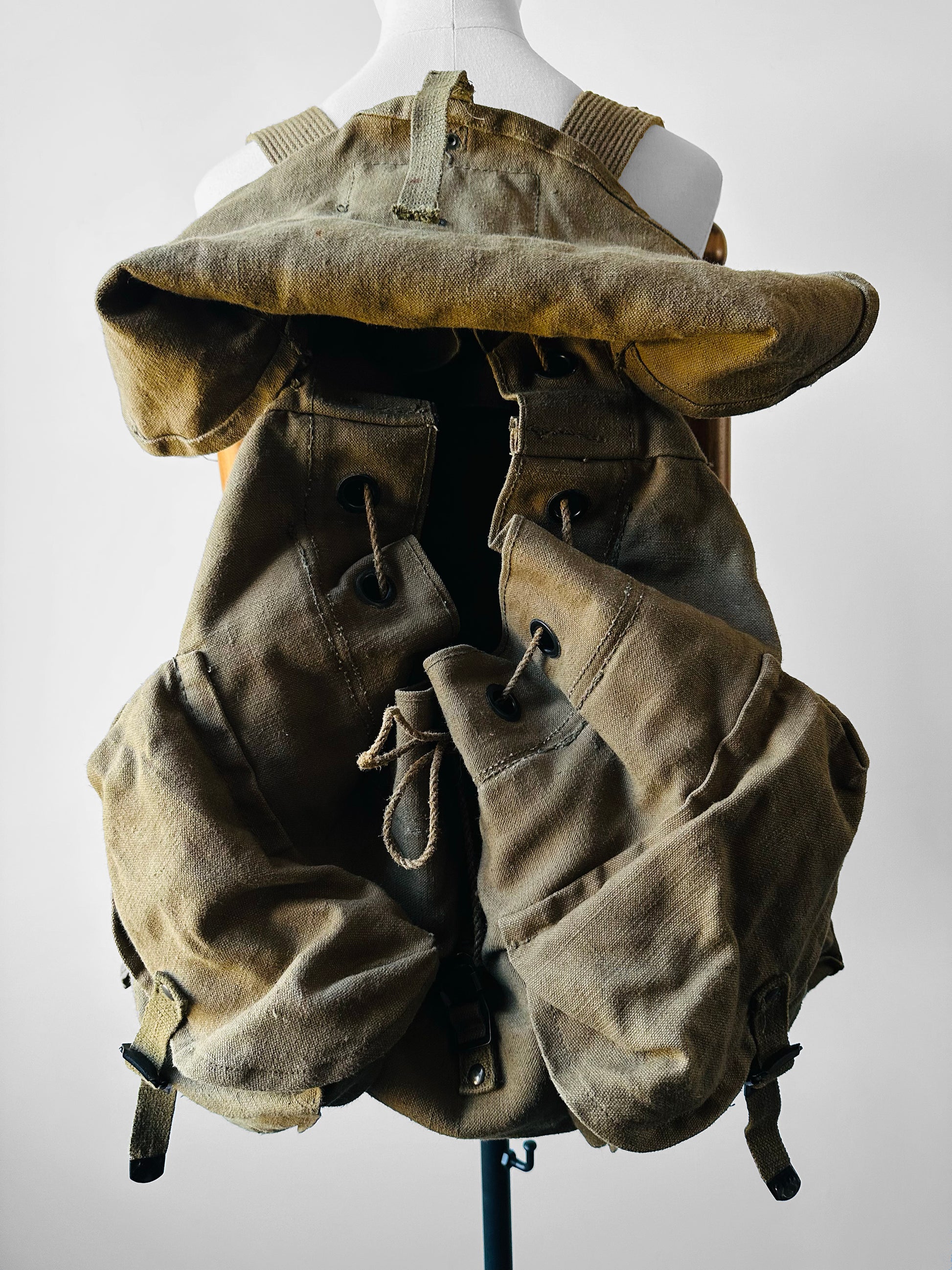 HISTORY: Military rucksacks have long stood as indispensable companions to soldiers, their design evolving from humble canvas sacks to robust, purpose-built gear. Engineered for endurance and utility, these packs bore the weight of essential provisions across unforgiving landscapes, their heavy-duty canvas and leather chosen for resilience against the harshest conditions.