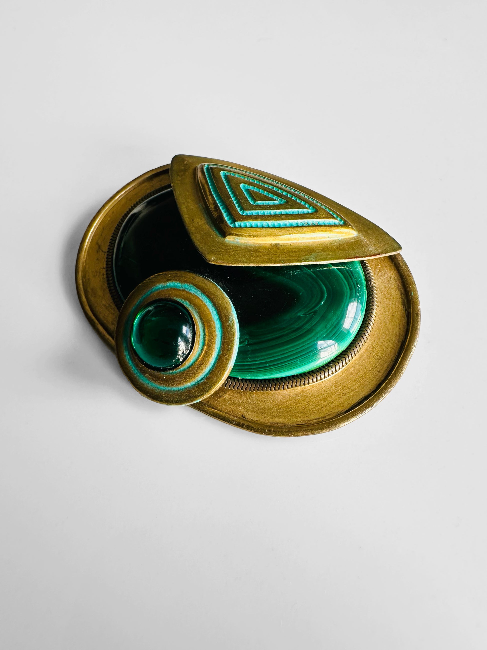 Antique Art Deco 1920s - 1930s Malachite Brooch with Geometric Design and Turquoise Enamel