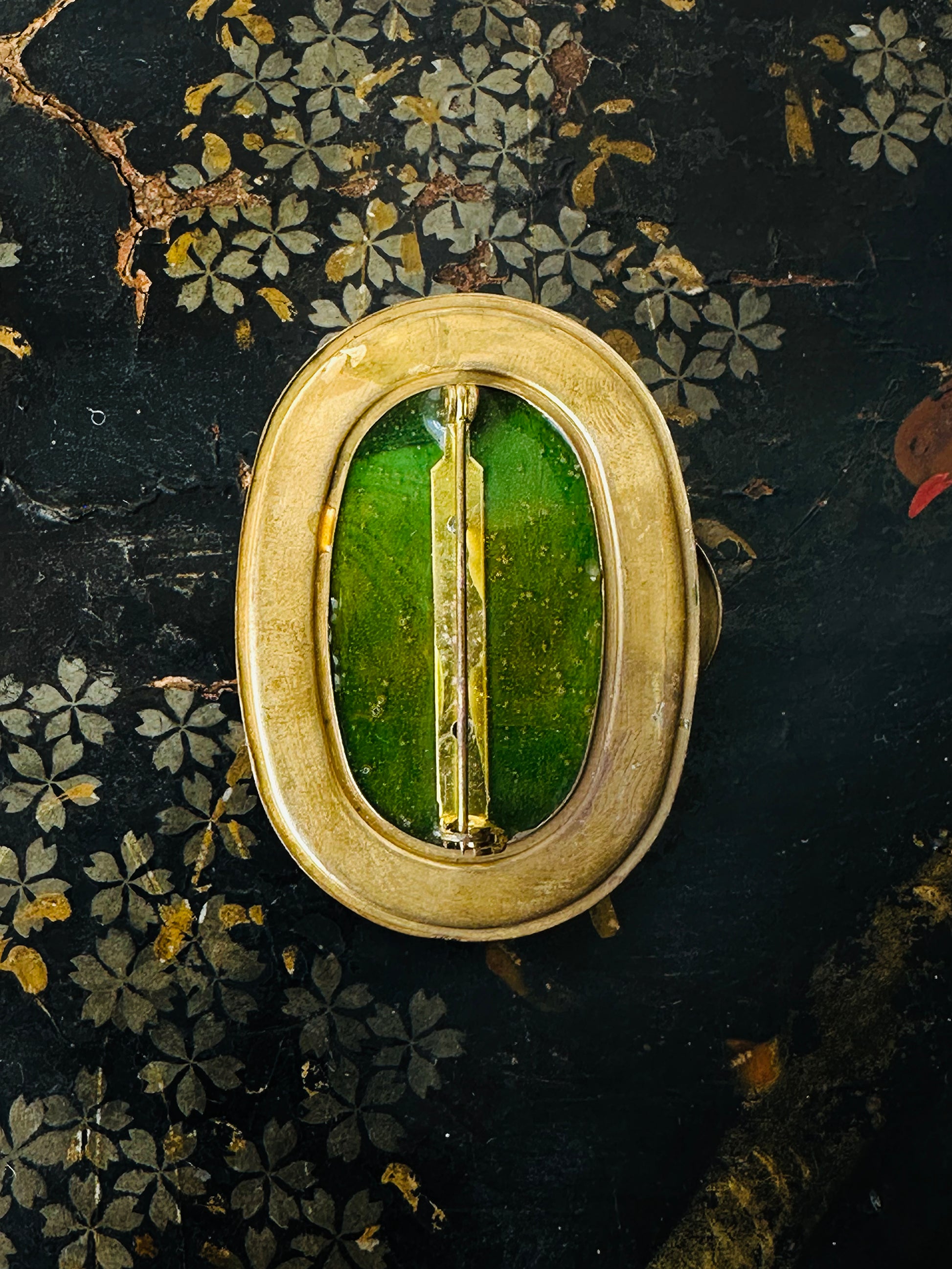 DESCRIPTIONS: This exquisite brooch captures the essence of the Art Deco era with its bold geometric design and striking contrast of materials. A deep green stone anchors the piece, complemented by sleek metallic tones and vibrant enamel accents—hallmarks of the movement’s love for drama and modernity. Popular in the 1920s and 1930s as statement jewelry, brooches like this added instant glamour and artistic flair to any ensemble. A timeless treasure for collectors and lovers of vintage elegance.