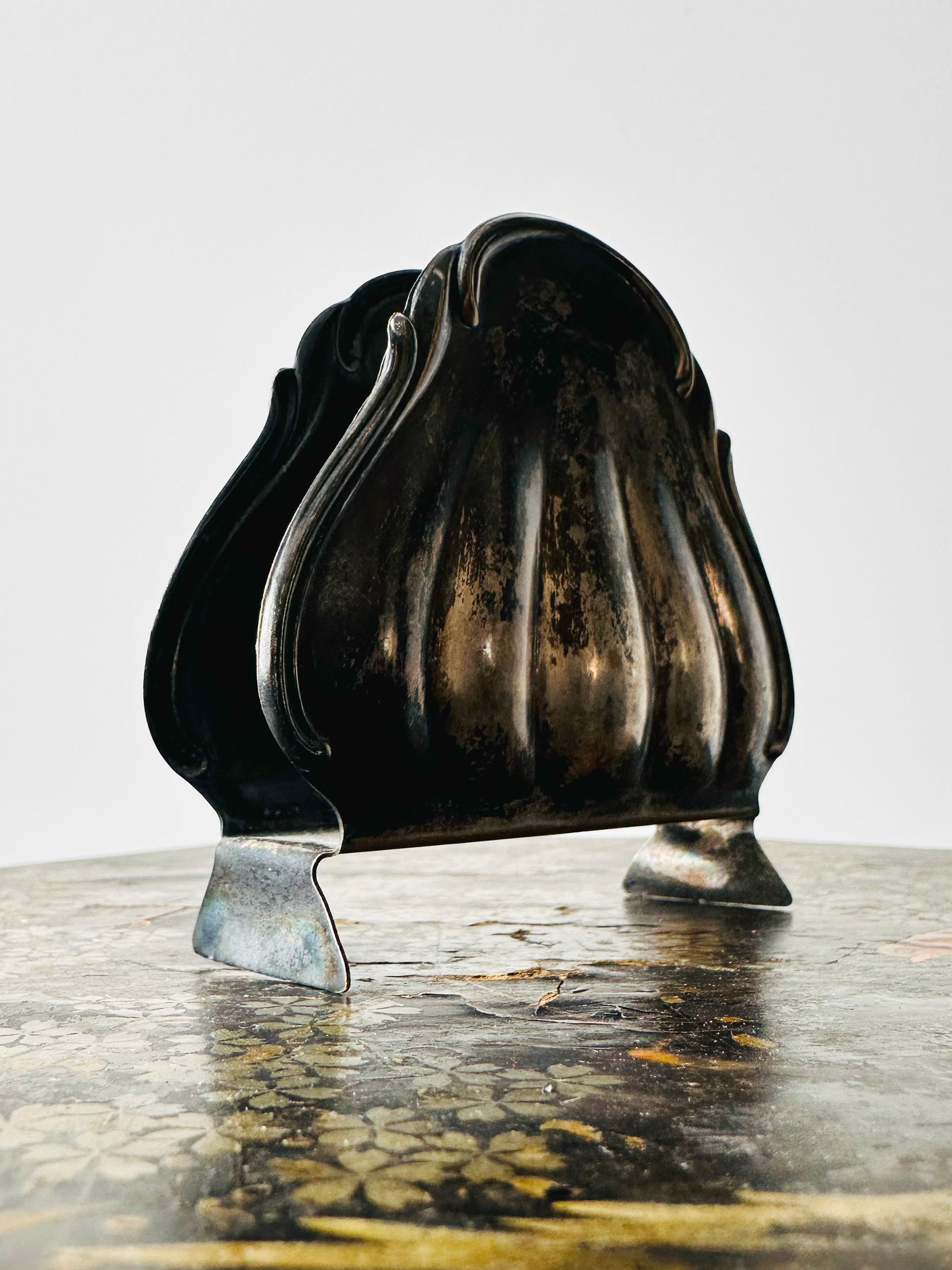 HISTORY: Swedish decorative arts from the late 19th and early 20th centuries beautifully balanced traditional craftsmanship with emerging design movements. While Art Nouveau and later Art Deco influenced the era, many functional pieces—such as napkin holders—retained classical or nature-inspired motifs, echoing broader European trends. These designs reflect a period of transition, where artistry and utility merged to create objects that were both practical and aesthetically refined.