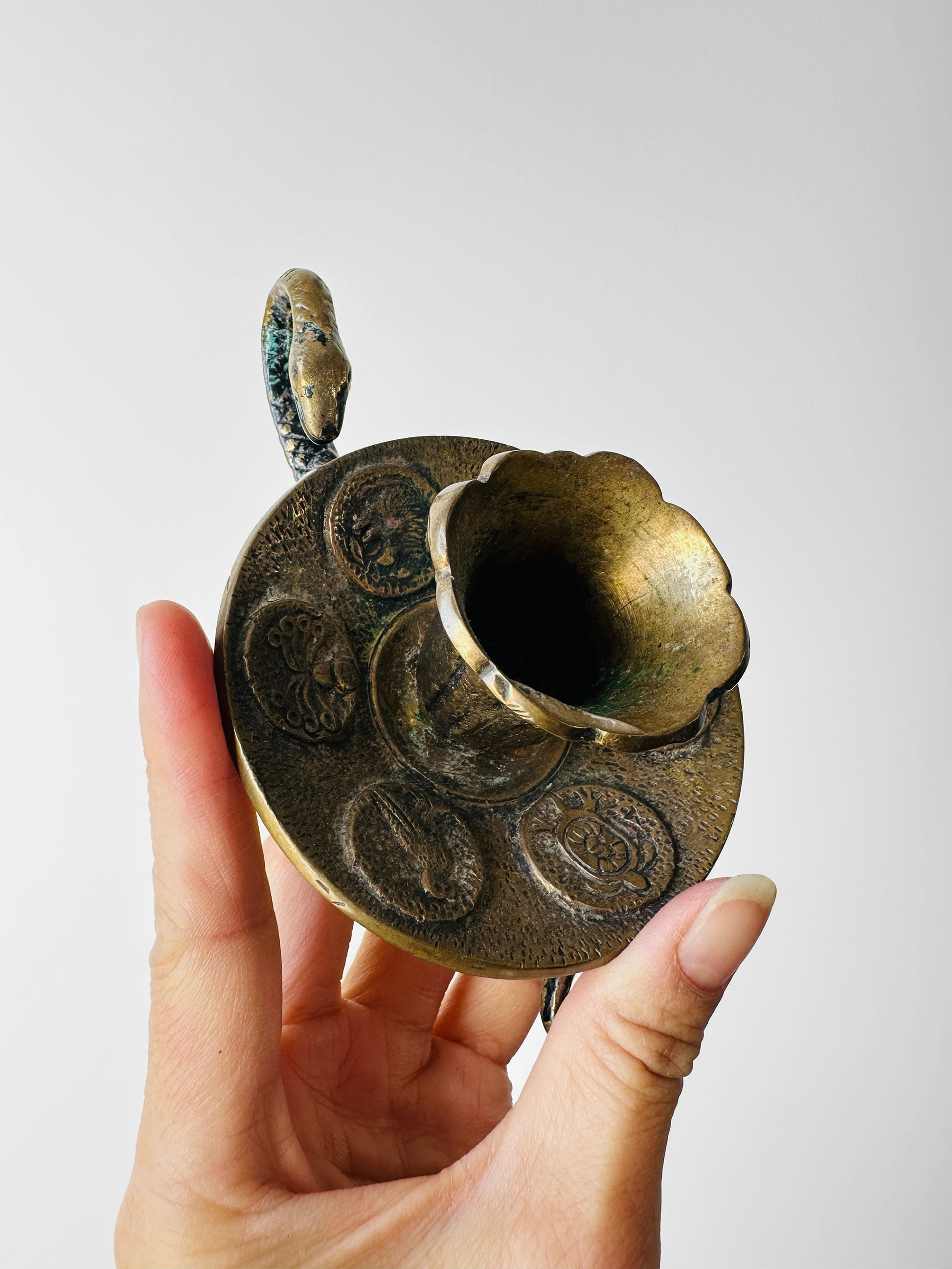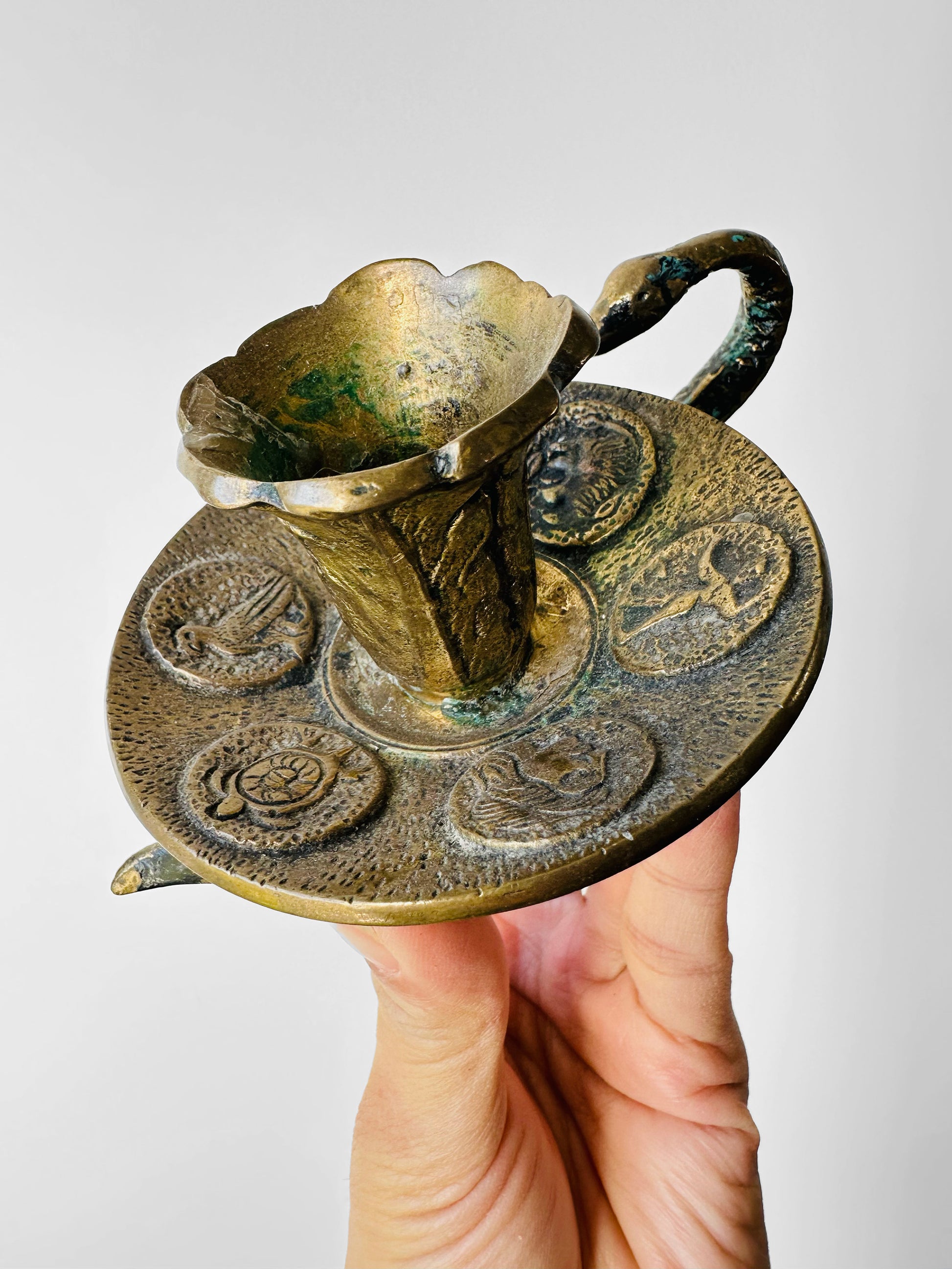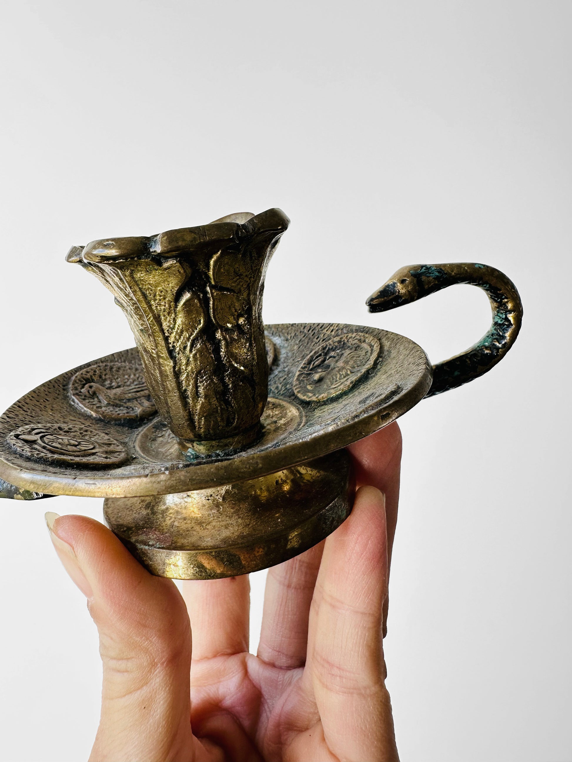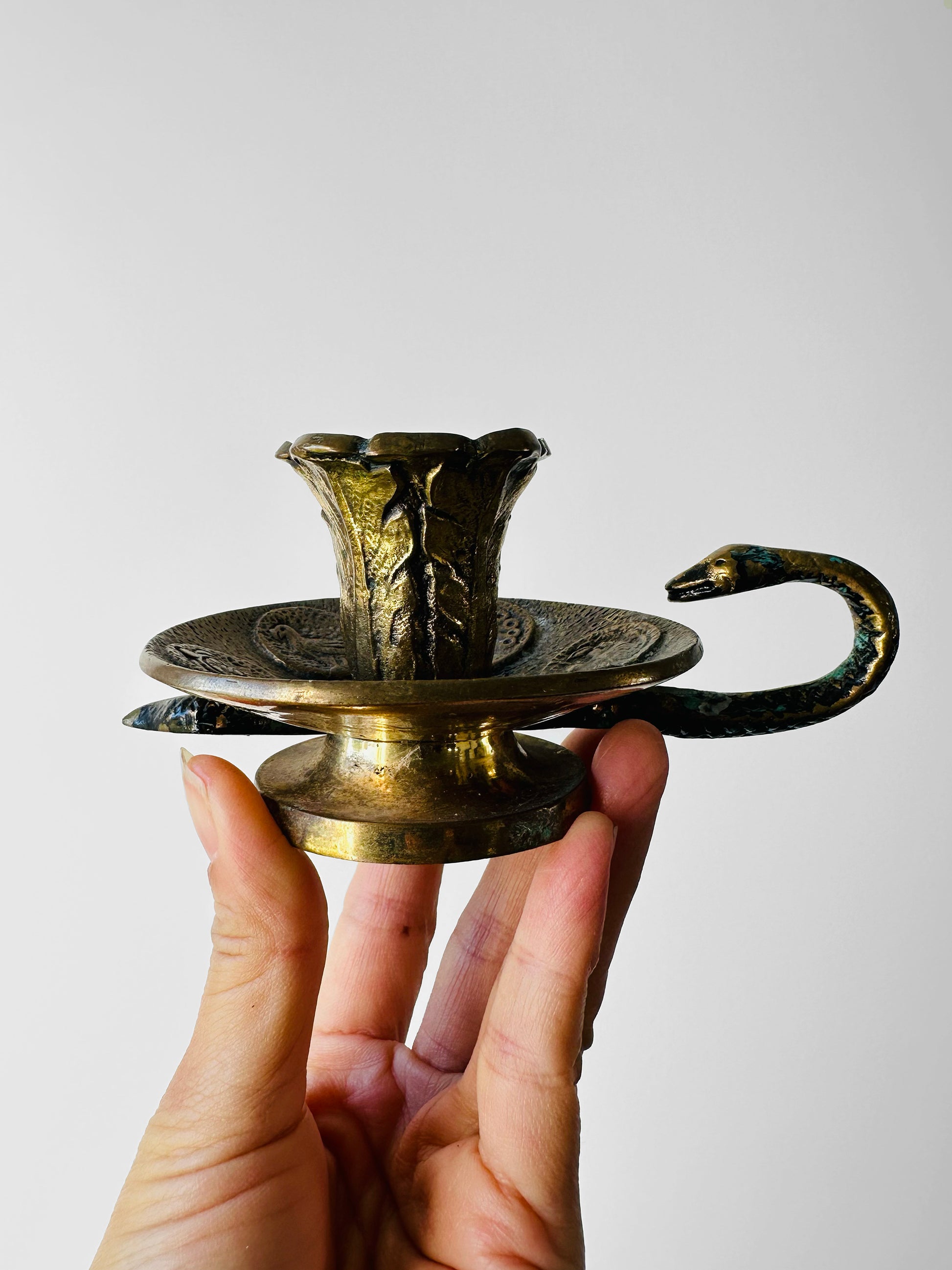 DESCRIPTIONS: This extraordinary brass candlestick is more than a lighting piece—it’s a work of art steeped in symbolism. Its sinuous serpent handle evokes themes of protection and transformation, while the medallion-adorned base hints at mythological or folkloric figures, adding layers of intrigue and meaning. Such ornate details were hallmarks of the Art Nouveau and Arts & Crafts movements, where nature and history inspired flowing forms and decorative elegance.