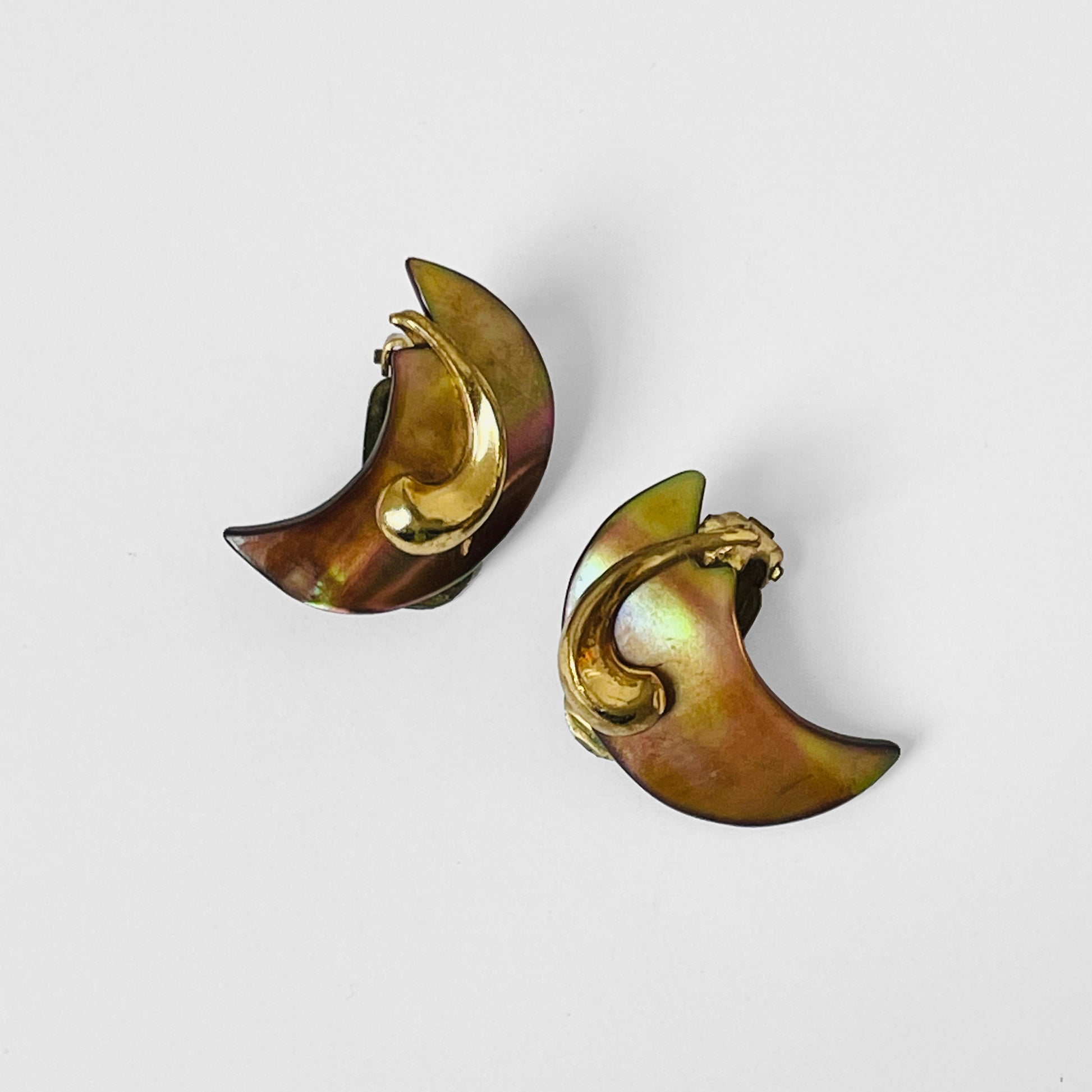 Gold-Toned Iridescent Shell Crescent Moon German Stamped Clip Earrings