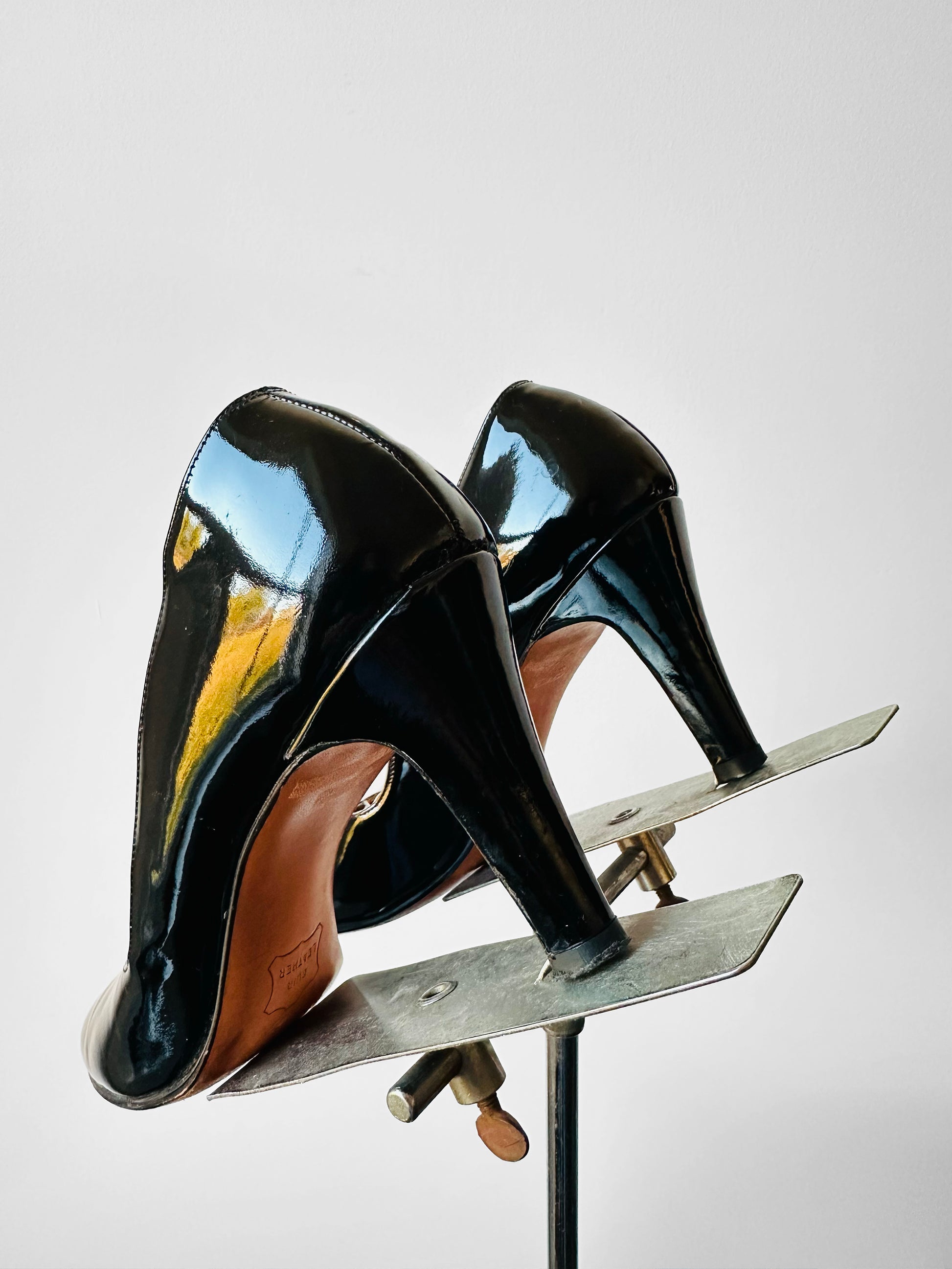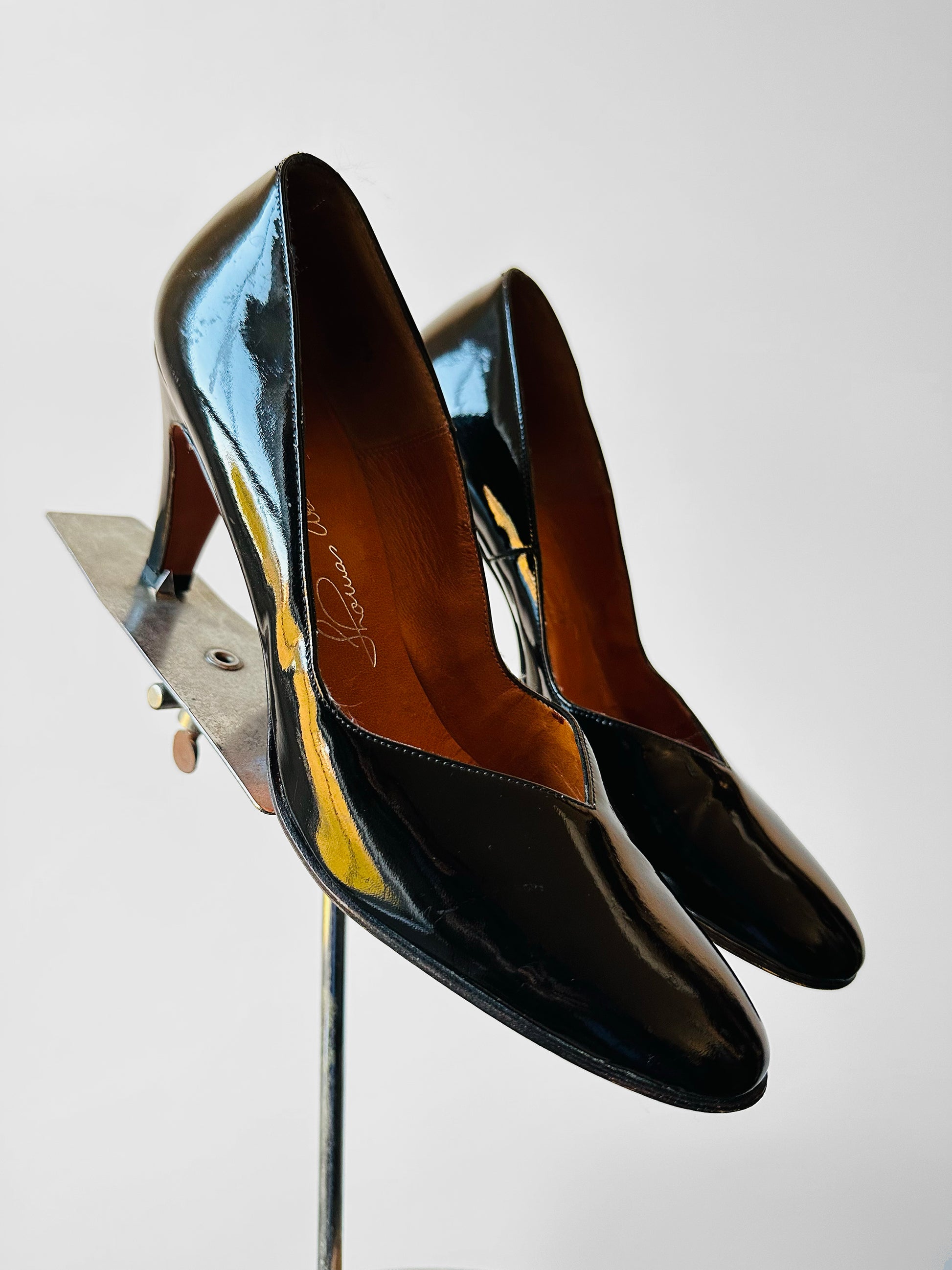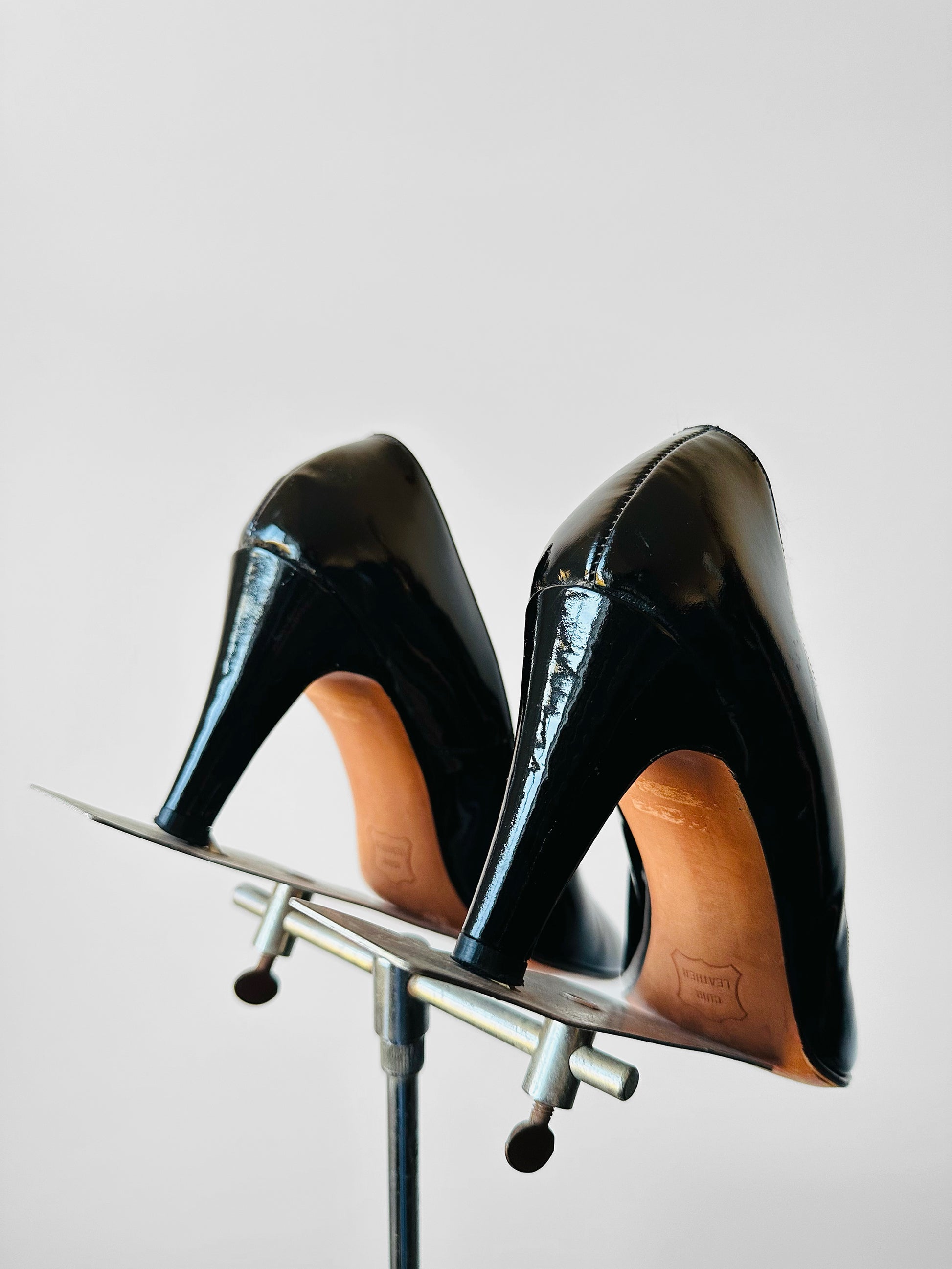 DESCRIPTION: Step into timeless elegance with these patent leather heels—where mid-century glamour meets modern sophistication. Their high-gloss finish catches the light with every move, adding a bold, polished edge to your look. The sleek pointed toe and chic V-shaped vamp evoke the iconic silhouettes of the 1950s and ’60s, reimagined for today’s style-conscious trendsetters. Perfect for evening soirées or elevating your everyday ensemble, these shoes are more than footwear—they’re a statement of confidence and refined taste.