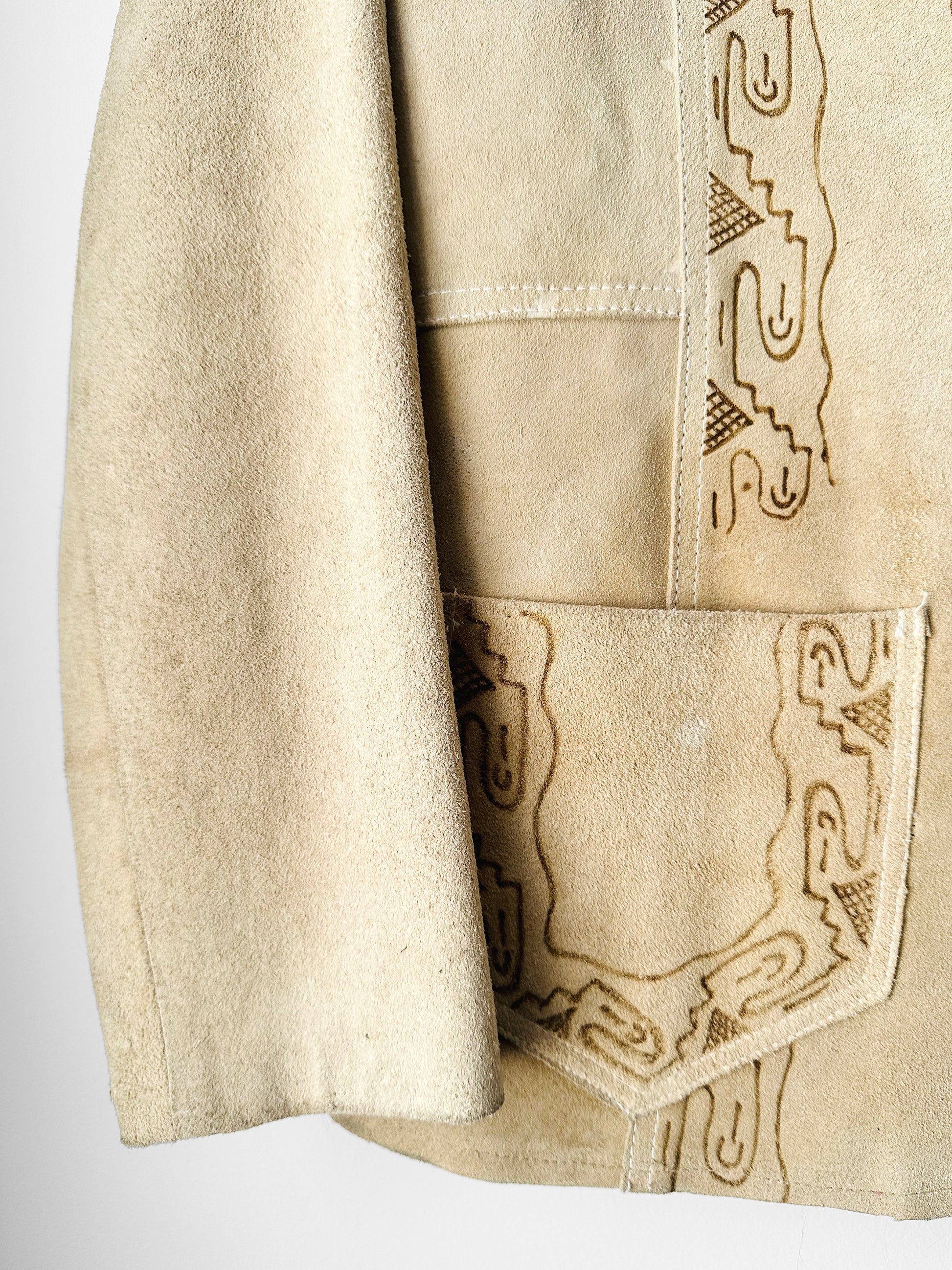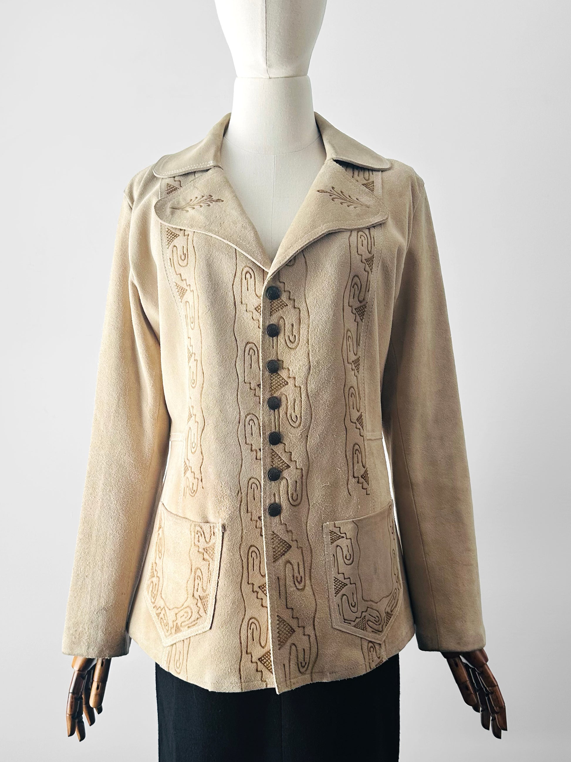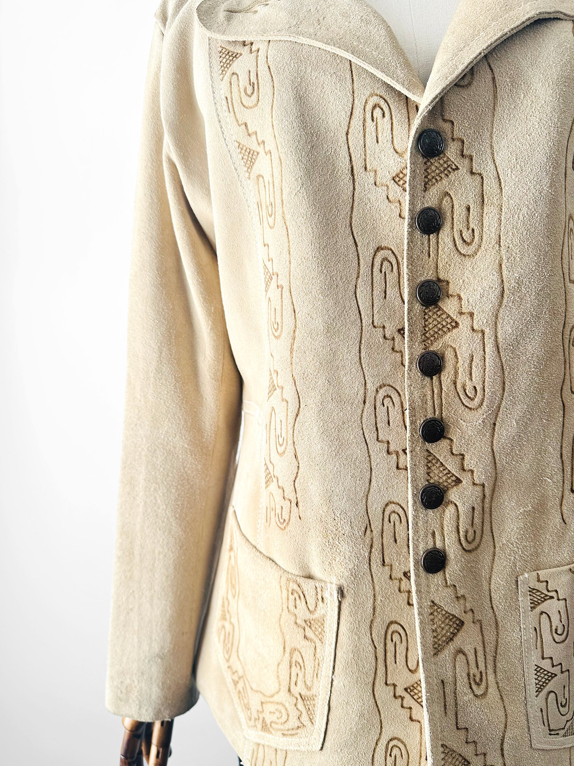 Vintage 1940s - 1950s Light Tan Snap-Button Suede Jacket with Embossed Southwestern/Aztec Designs - Sz. S/M