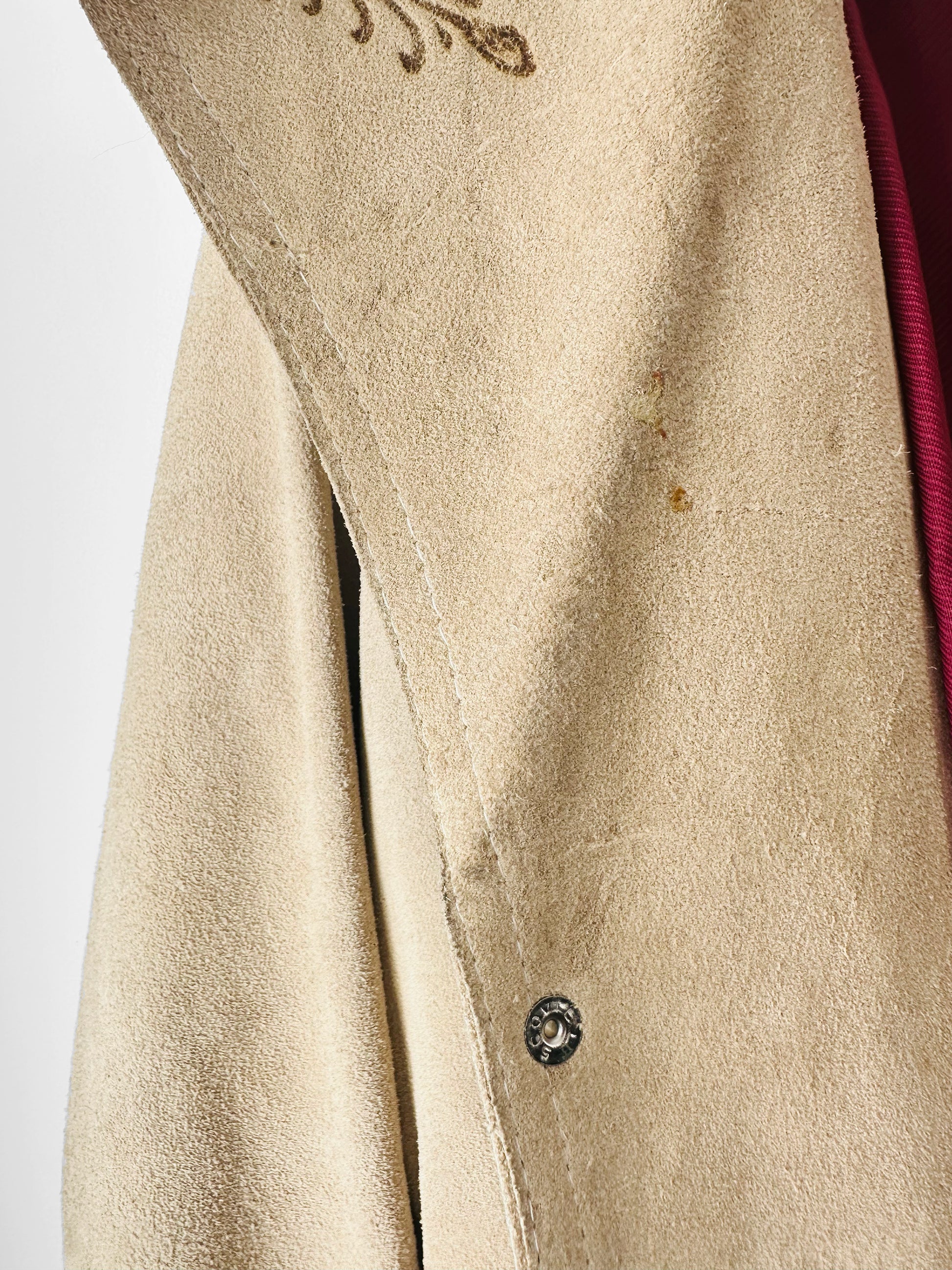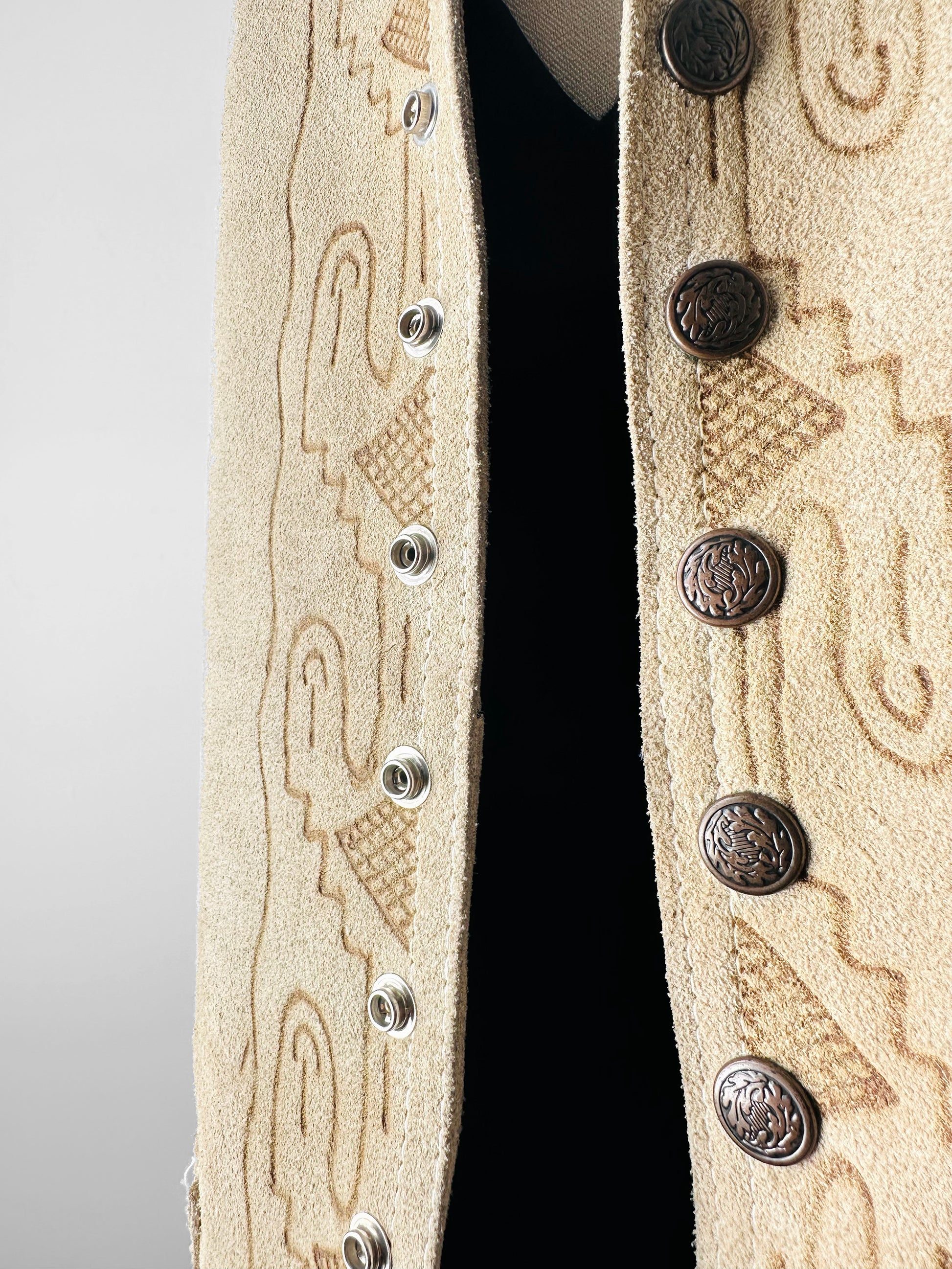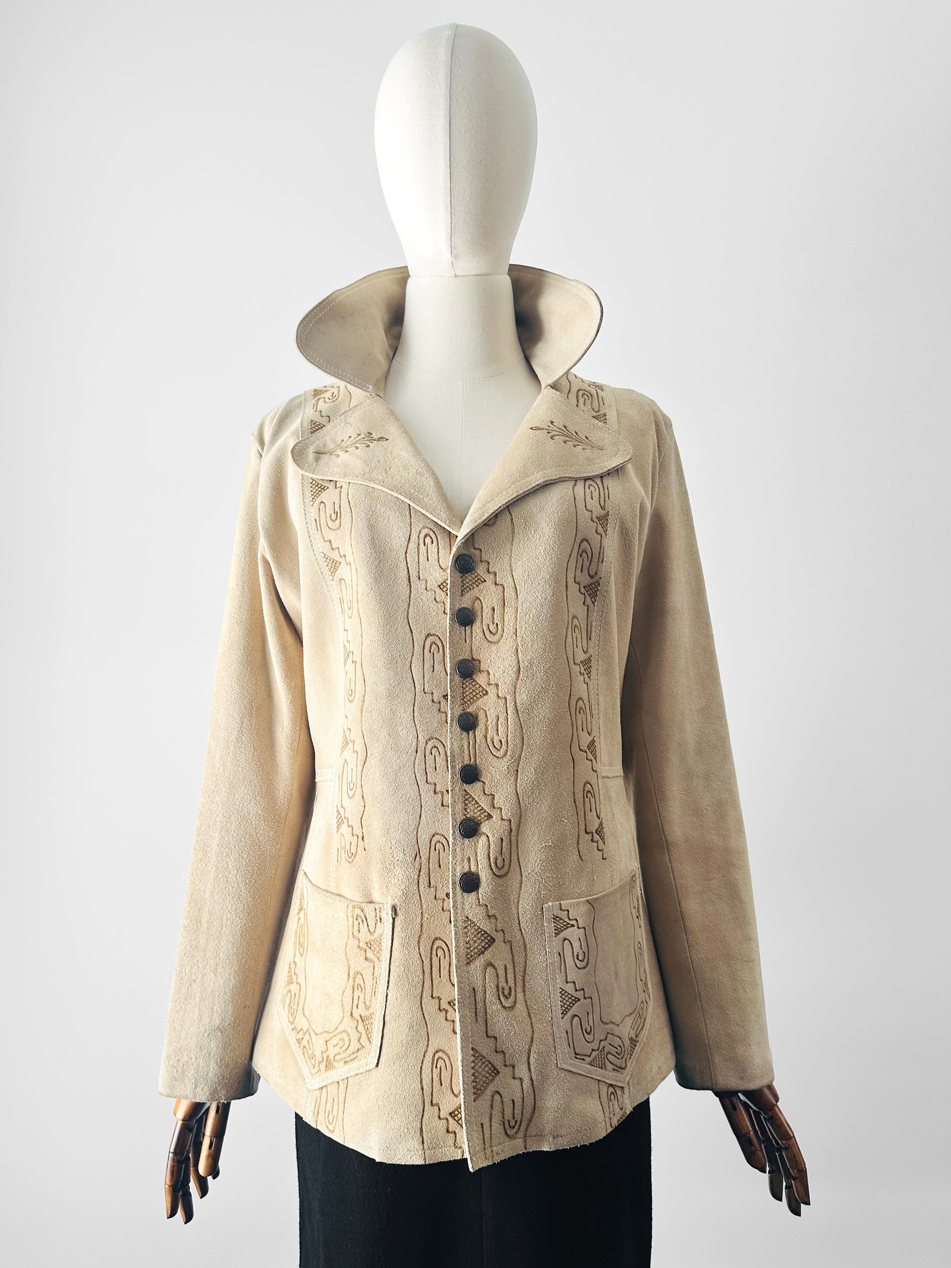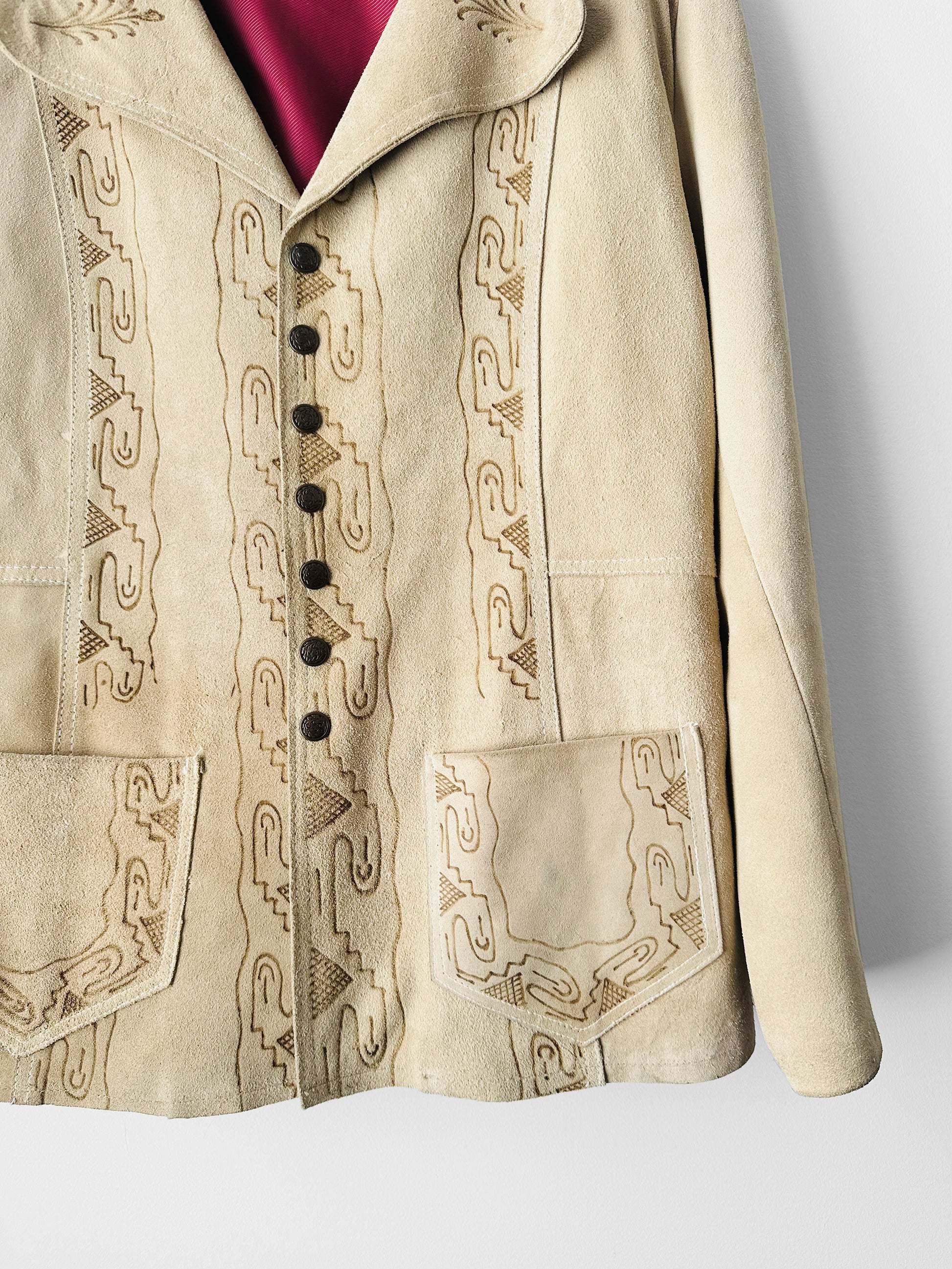 HISTORY: Suede jackets adorned with Western and Southwestern‑inspired motifs rose to prominence in the mid‑20th century, reflecting a growing fascination with indigenous artistry and skilled leatherwork. Crafted by artisans versed in embossing, tooling, and appliqué, these garments often featured bold geometric designs and richly colored linings that added depth and distinction. The stylized patterns seen here echo the “Aztec” and Southwestern aesthetic popular in the 1940s and 1950s, when such jackets became emblematic of Western wear, ranch life, and a romanticized connection to the American frontier. Today, they are prized for their craftsmanship and their enduring place in fashion history.