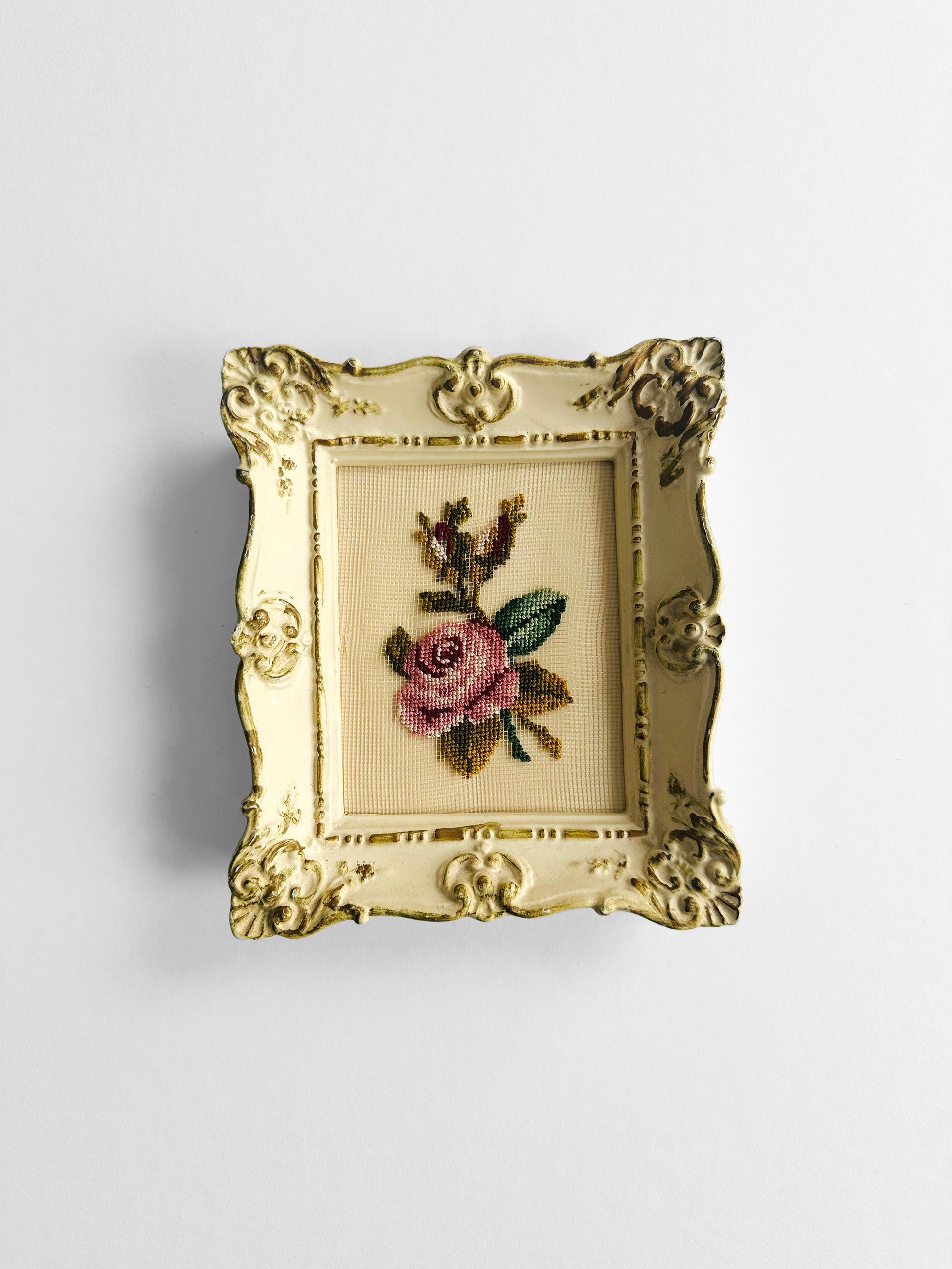 Vintage 1950s - 1960s Cream Framed Victorian Rose Petit Point Wall Hanging