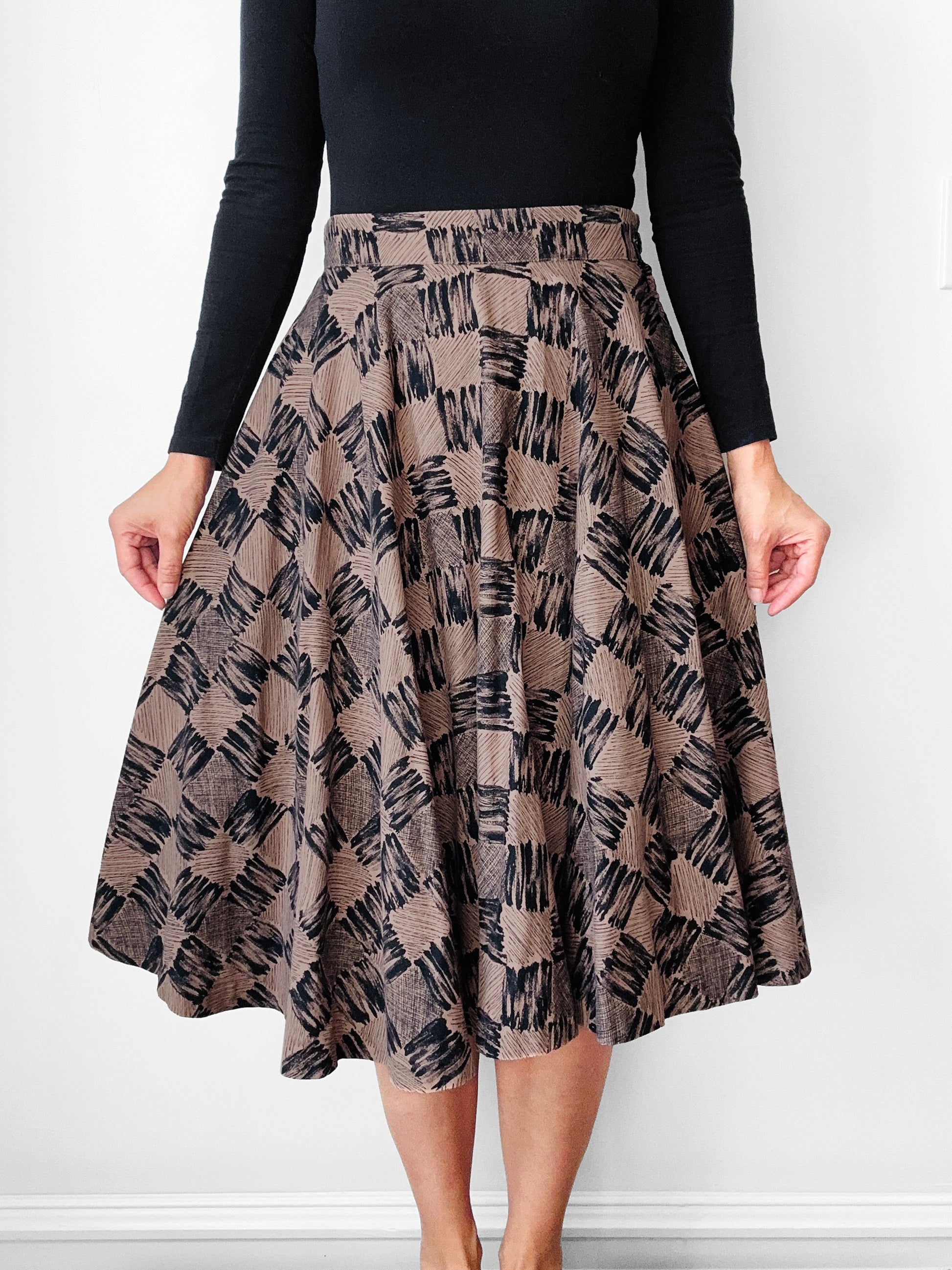 HISTORY: The mid-20th century, particularly the 1950s, saw a surge in popularity for bold geometric prints in fashion, influenced by the Mid-Century Modern design movement. This era embraced abstract patterns, clean lines, and a blend of artistic expression with everyday wear. Skirts, especially flared and circle styles, were a staple of women's wardrobes, offering both comfort and a fashionable silhouette.