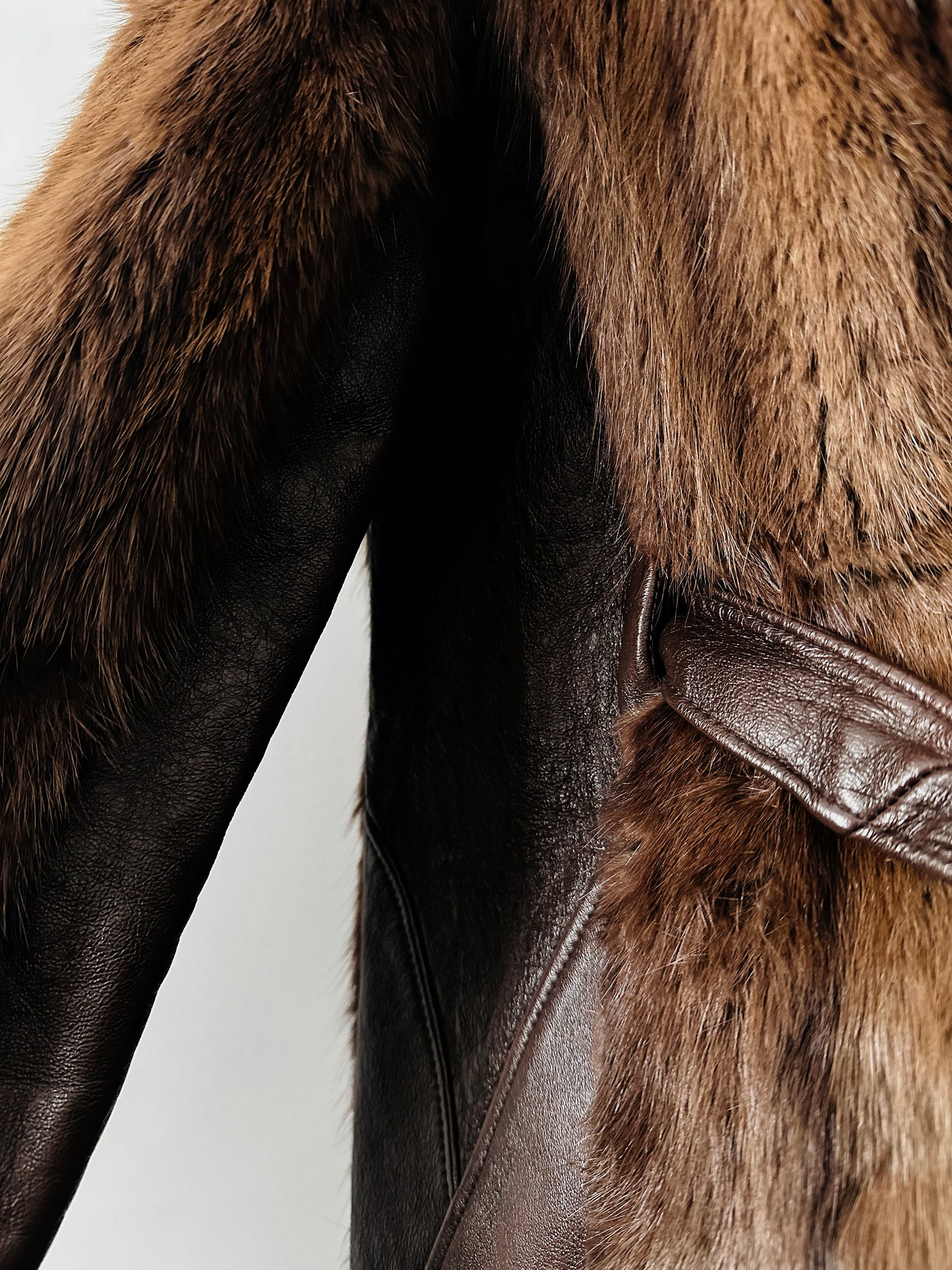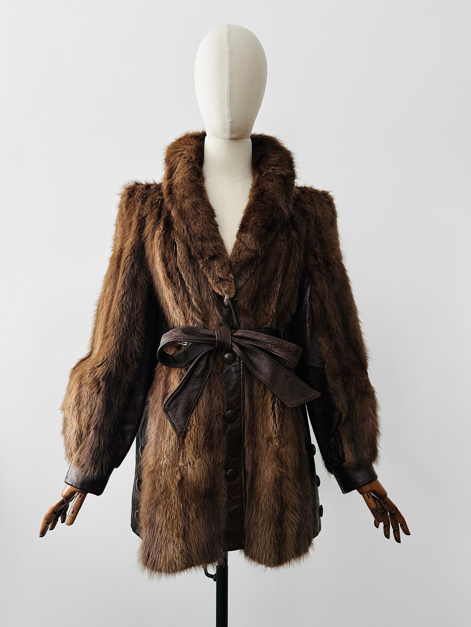 DESCRIPTION: Vintage 1960s–1970s brown leather jacket with a belted silhouette and dramatic cape‑back design, finished with plush fur detailing for extra warmth and style. Blending structure with movement, this standout piece has a distinctive mid‑century feel that’s both cozy and eye‑catching. Rich in texture and timeless appeal, it captures the bold confidence of late‑’60s and ’70s outerwear with effortless vintage flair.