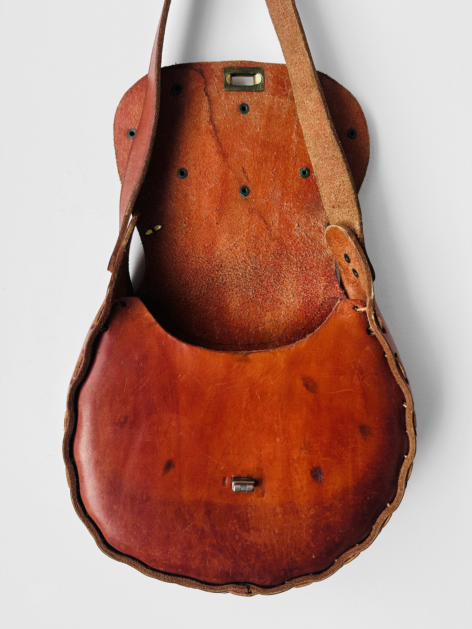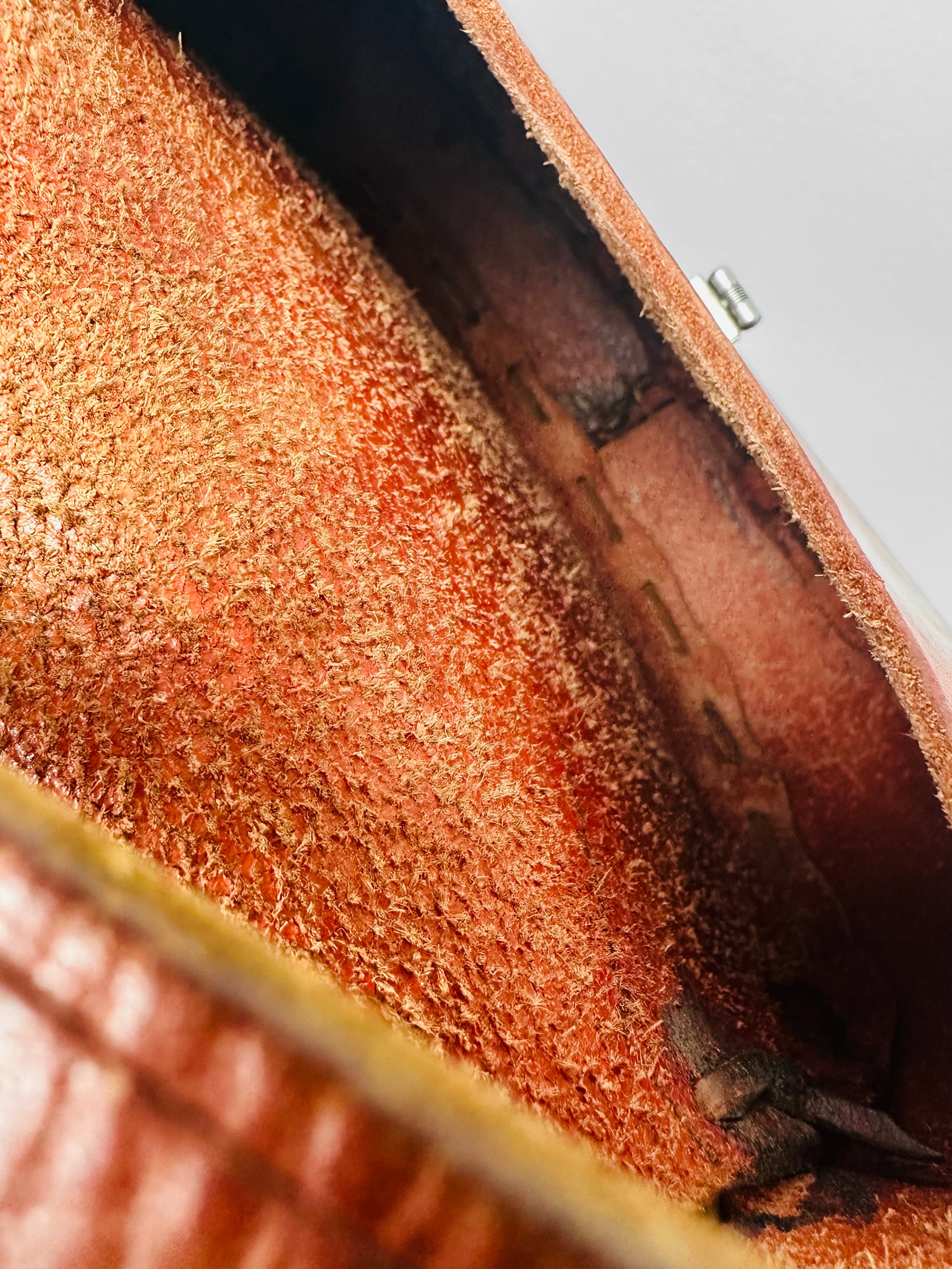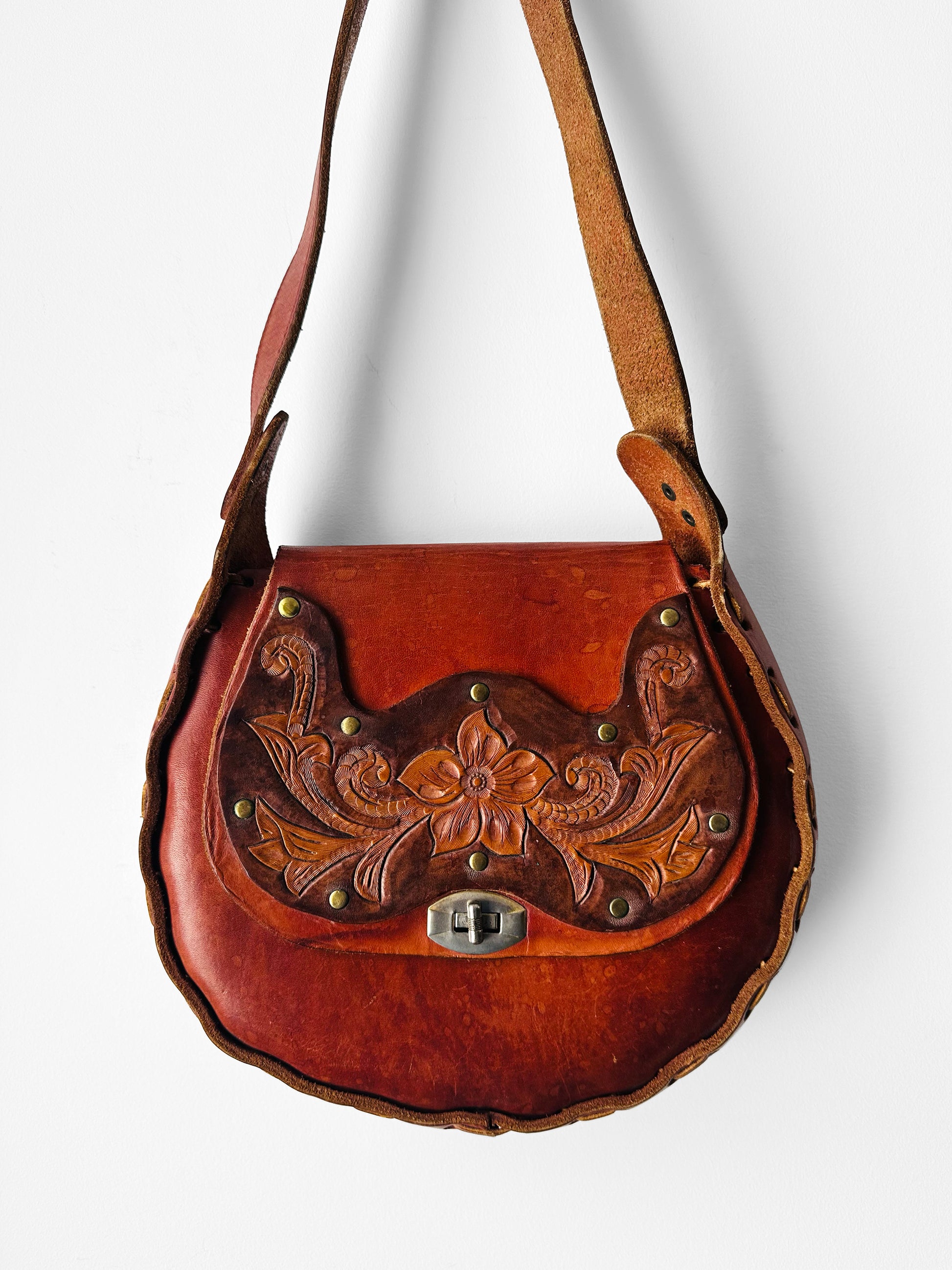 DESCRIPTION: Add rich texture and vintage character to your look with this 1960s–1970s tooled leather bag in a warm reddish‑brown and tan palette. Crafted from sturdy leather, it features beautifully detailed floral tooling that showcases classic Western artistry and hand‑finished appeal. The earthy tones and graceful motif give it a timeless, well‑loved feel—perfect for everyday wear or as a statement accessory. Equal parts practical and distinctive, this bag captures the spirit of mid‑century Southwestern style with effortless vintage flair.