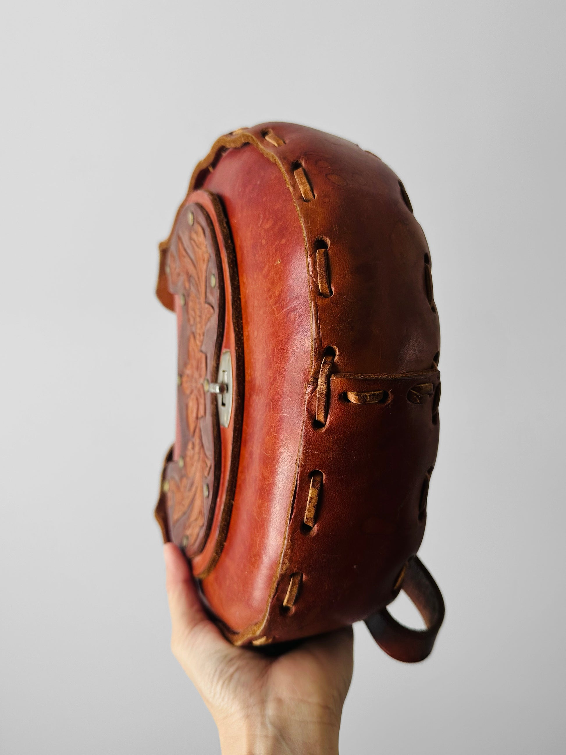 Vintage 1960s - 1970s Reddish Brown Floral Motif Tan Tooled Leather Bag