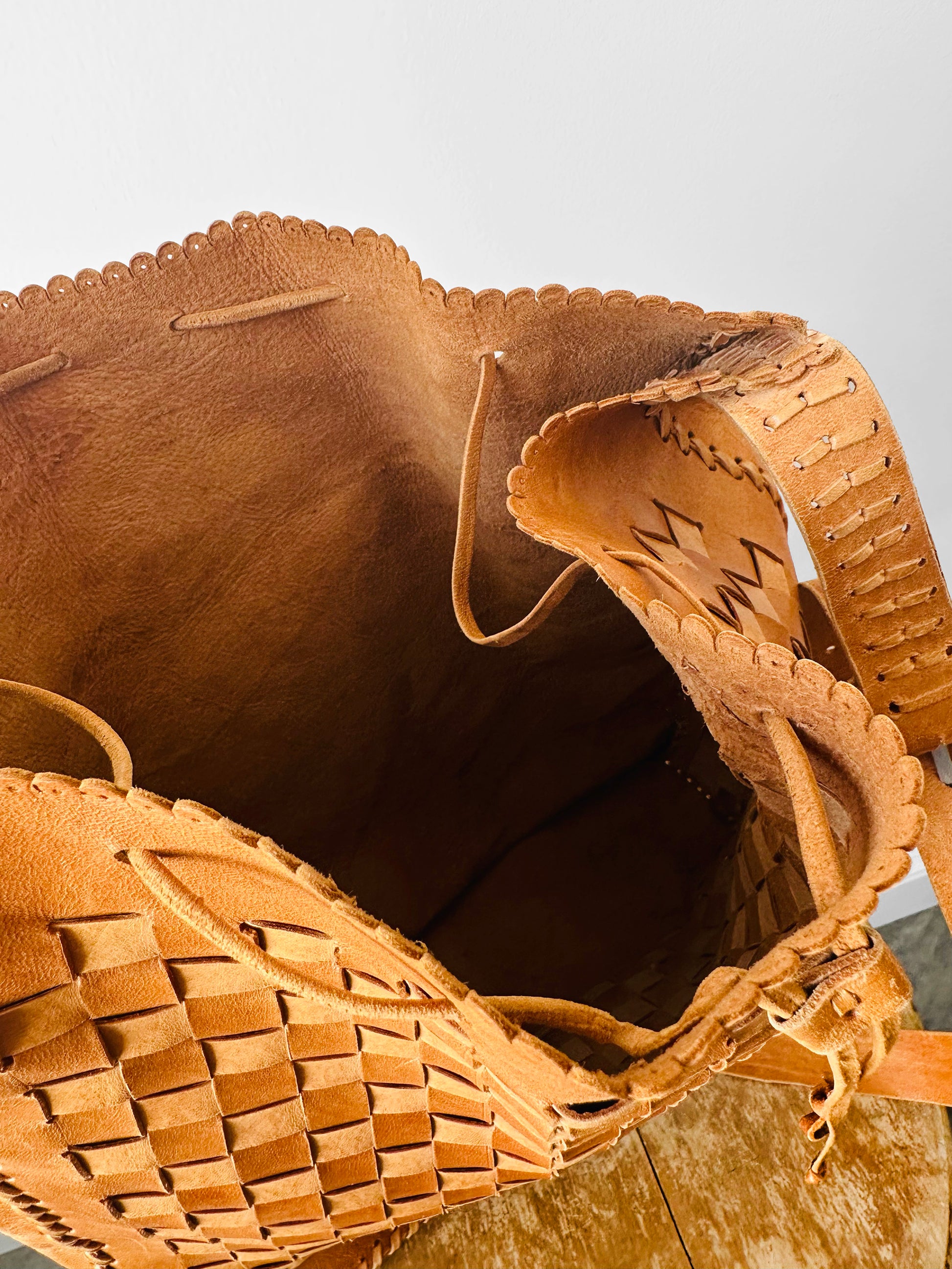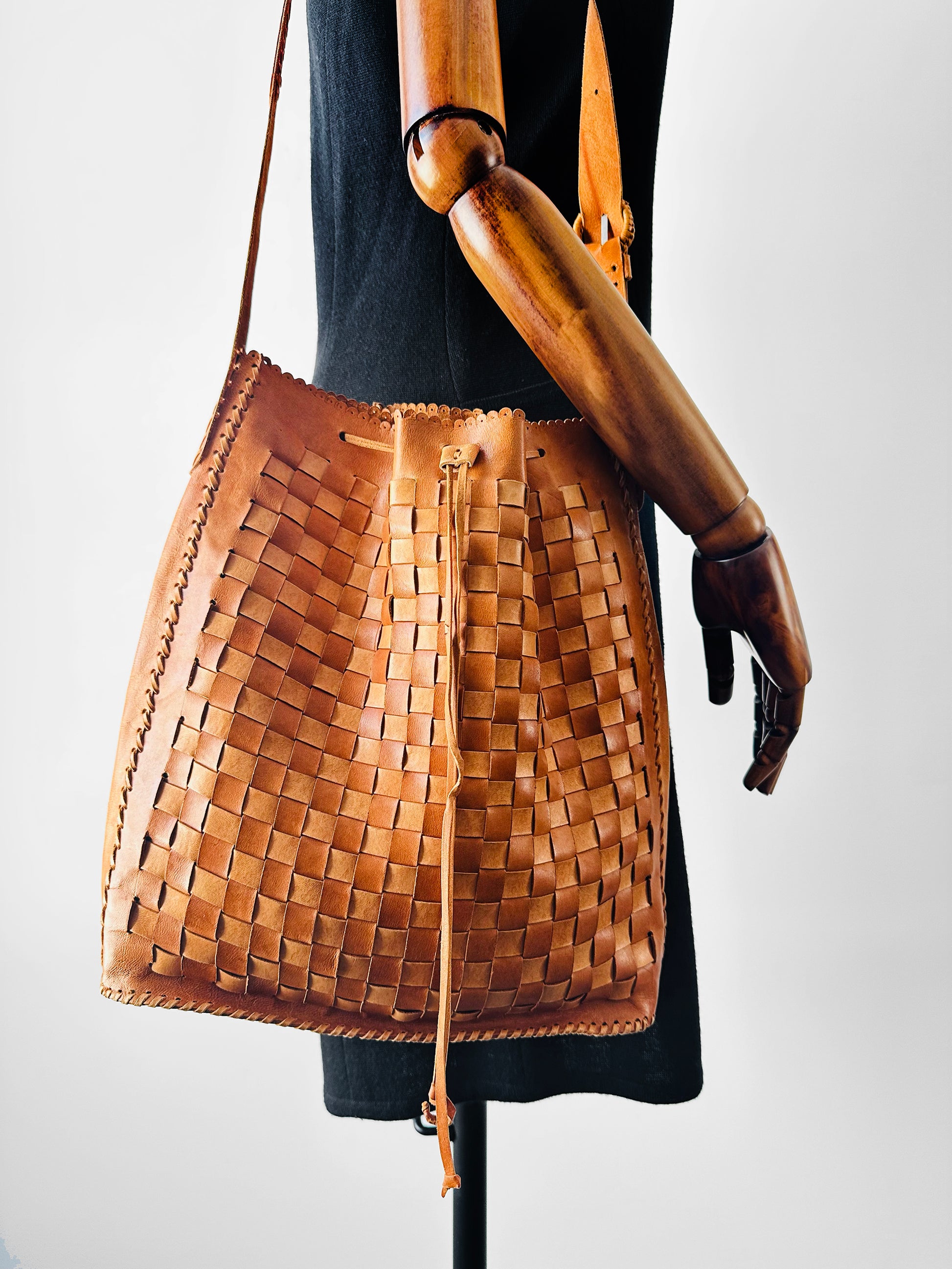 DESCRIPTION: Vintage 1970s tan leather drawstring shoulder bag with a soft basketweave design and an easy, relaxed feel. Made from buttery smooth leather, it features a slouchy silhouette that’s perfect for everyday wear, with warm neutral tones that pair effortlessly with any outfit. A timeless, well‑crafted piece that captures laid‑back ’70s style with subtle vintage charm.