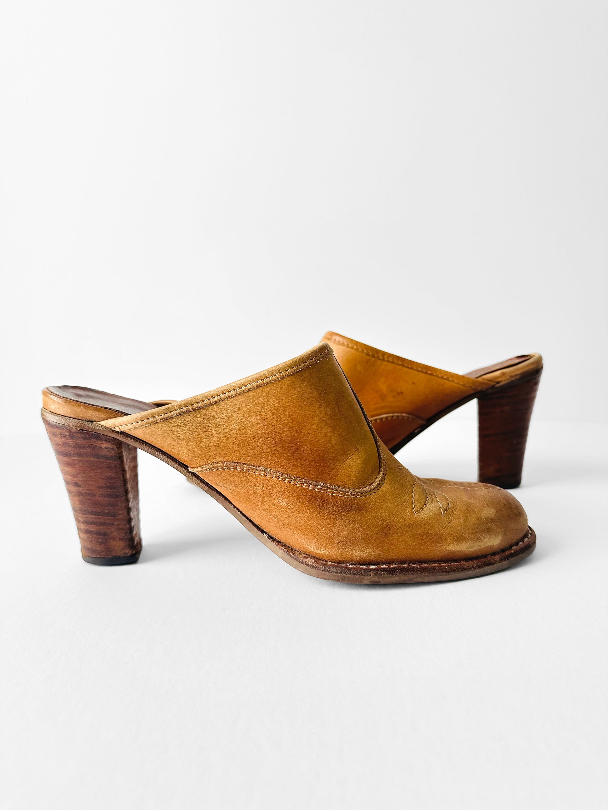 DESCRIPTION: Classic 1970s tan leather mules with an easy slip‑on design and Western‑inspired charm. Featuring a backless silhouette, pointed toe, and stacked wooden heel, they have a relaxed, worn‑in feel that pairs effortlessly with denim, dresses, or flared trousers. Timeless and comfortable, these vintage mules add just the right touch of retro character to everyday looks.
