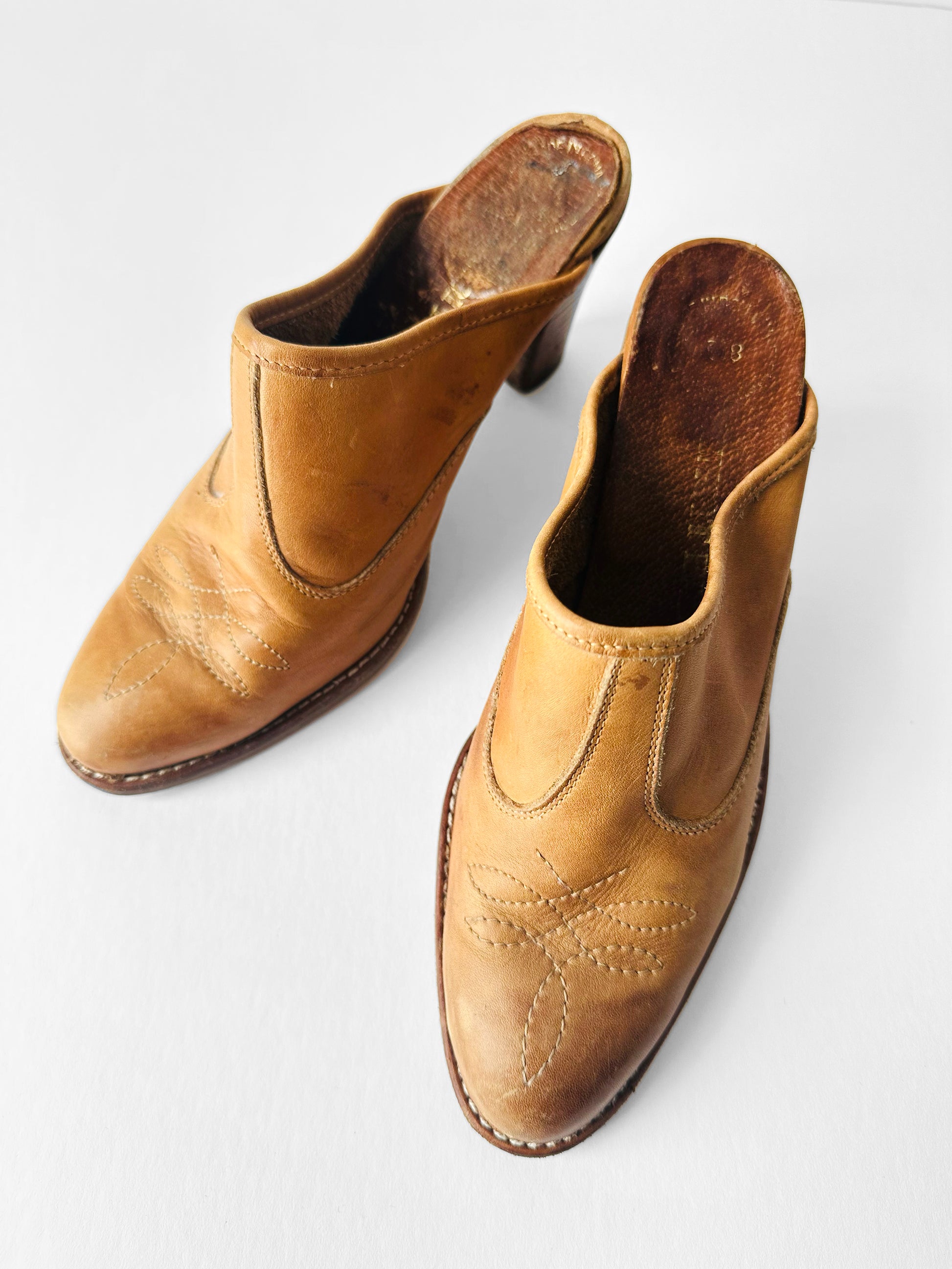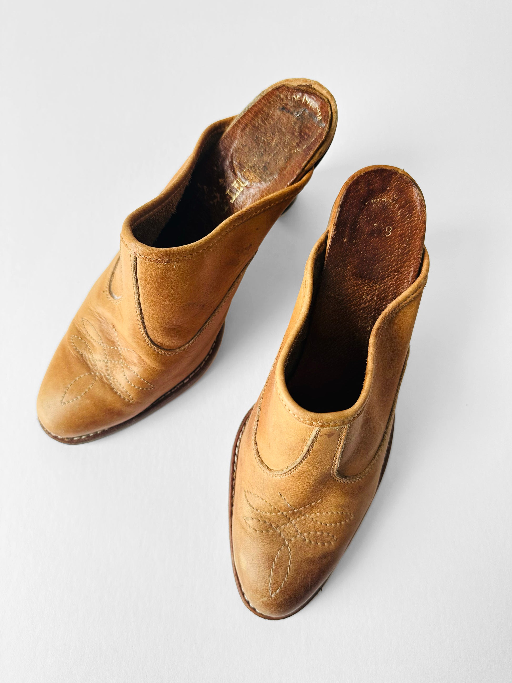 Vintage 1970s Tan Western-Style Slip-On Leather Mules with Stacked Wooden Heel - Sz. 8