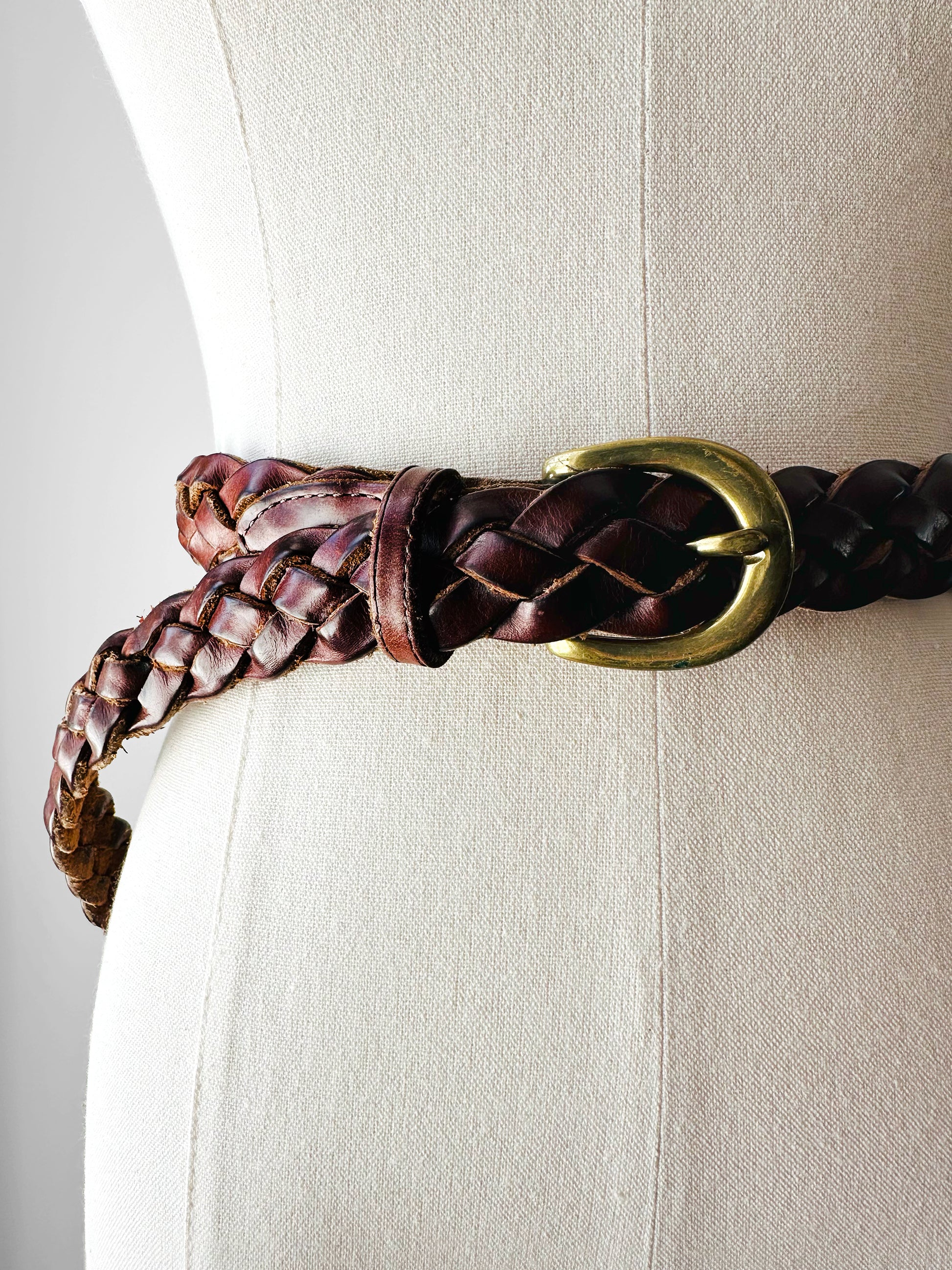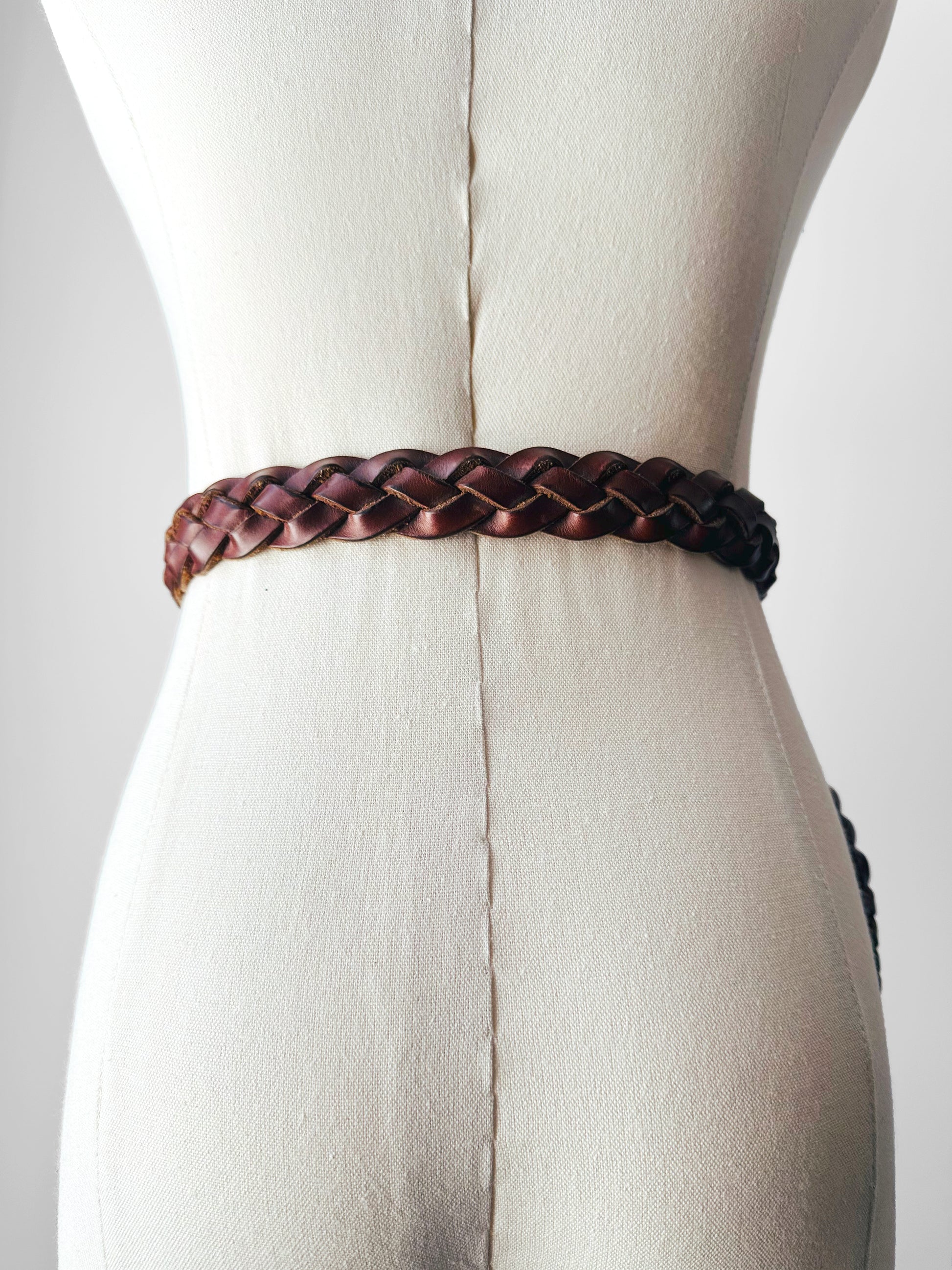 DESCRIPTION: Add a polished vintage touch to any outfit with this 80s - 90s reddish‑brown leather belt, finished with intricate braided detailing and a bold gold‑tone buckle. The rich burgundy leather tone and textured design give it that perfectly broken‑in vintage feel—easy to style with denim, trousers, or cinched over a dress. Timeless, versatile, and effortlessly cool.